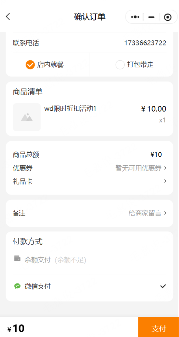 限时折扣内设置仅限储值余额整单支付享受折扣,无效;余额支付应用原价,不享受限制折扣价。