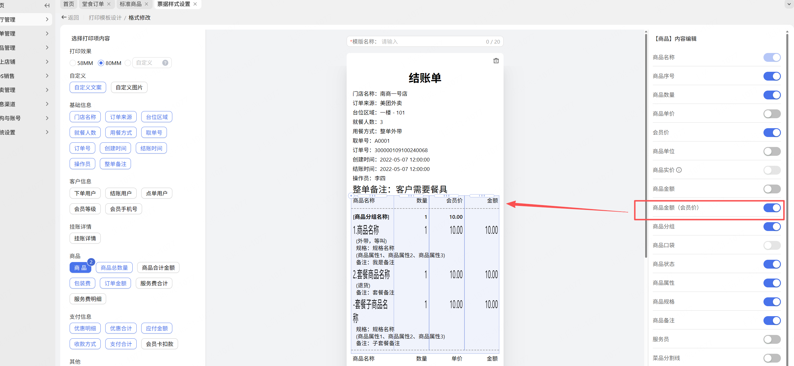 3.【网页/POS】打印格式中【商品】字段中增加:金额(会员价)