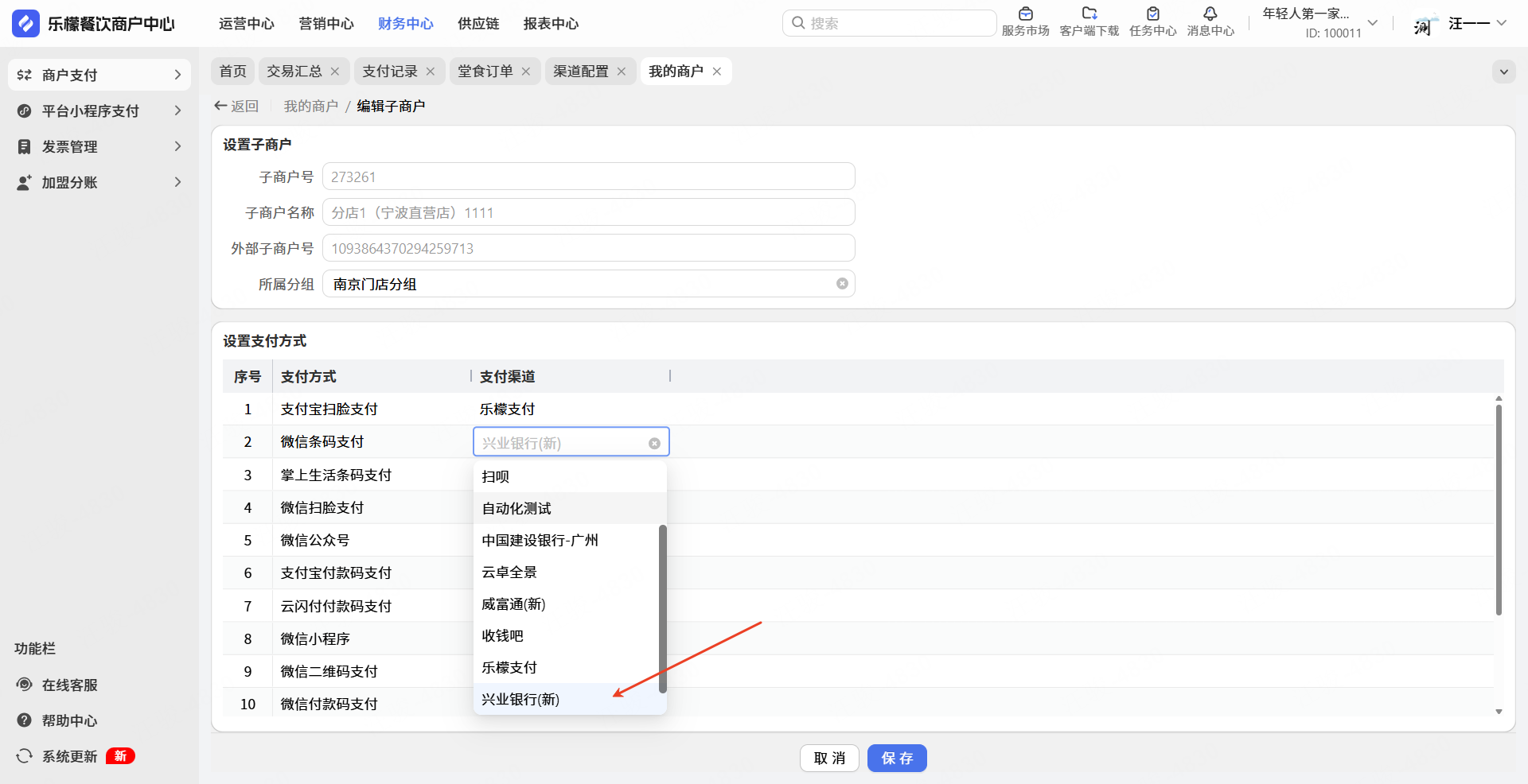 3.我的商户中编辑,针对指定支付方式设置兴业银行(新)通道。