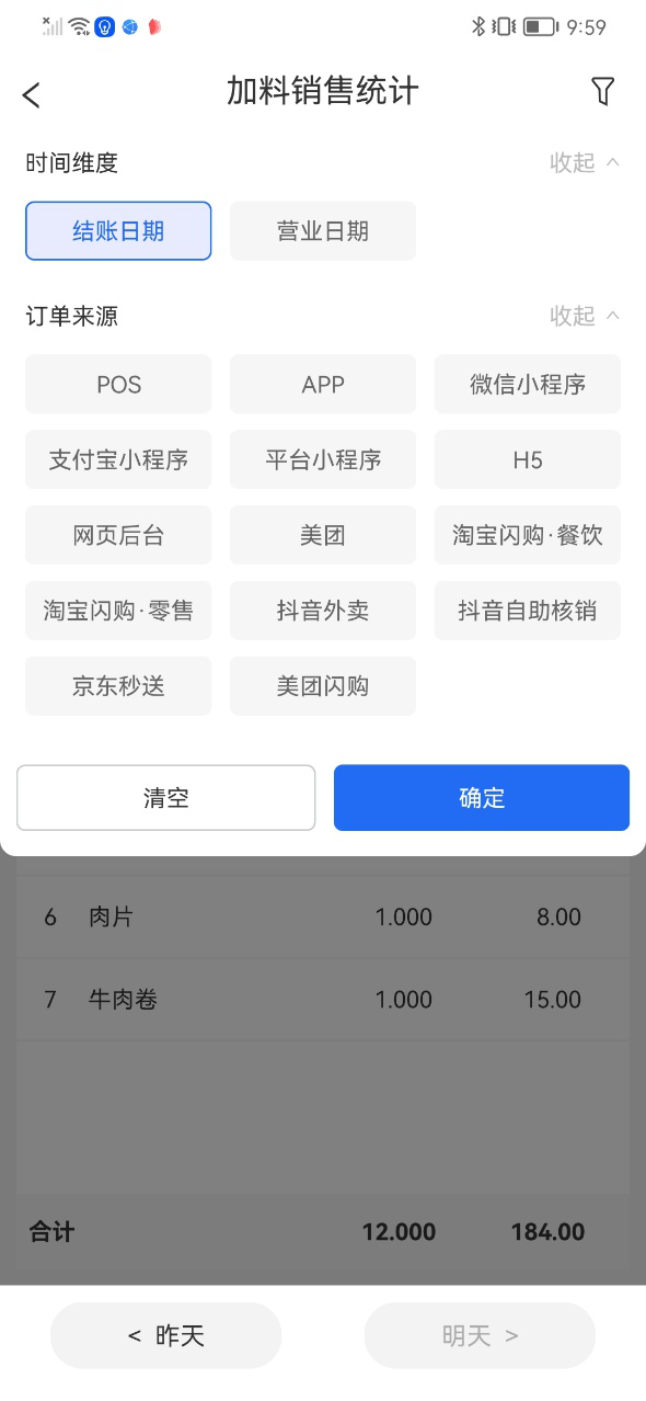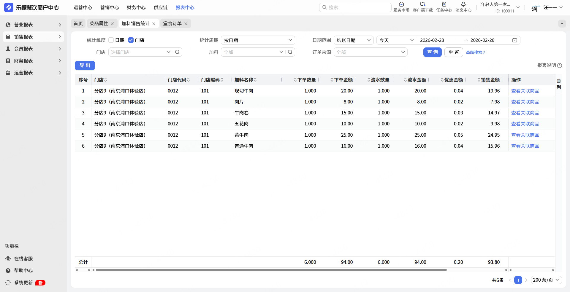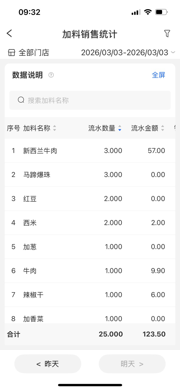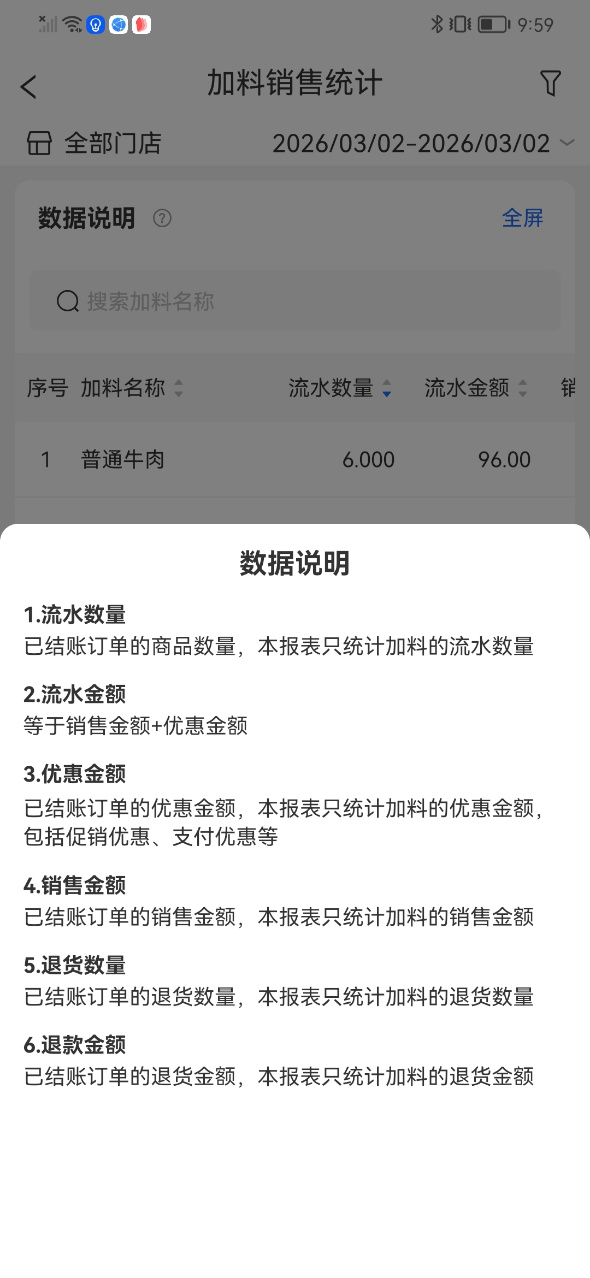 可按照日期/门店维度筛选,该报表只统计加料销售数据。