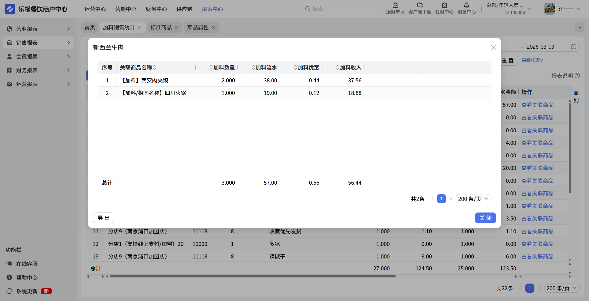 2.针对加料销售,可查看关联商品,了解具体哪些商品下单了该种加料。