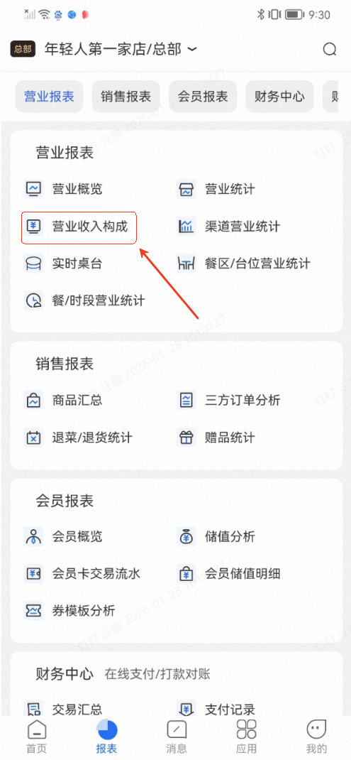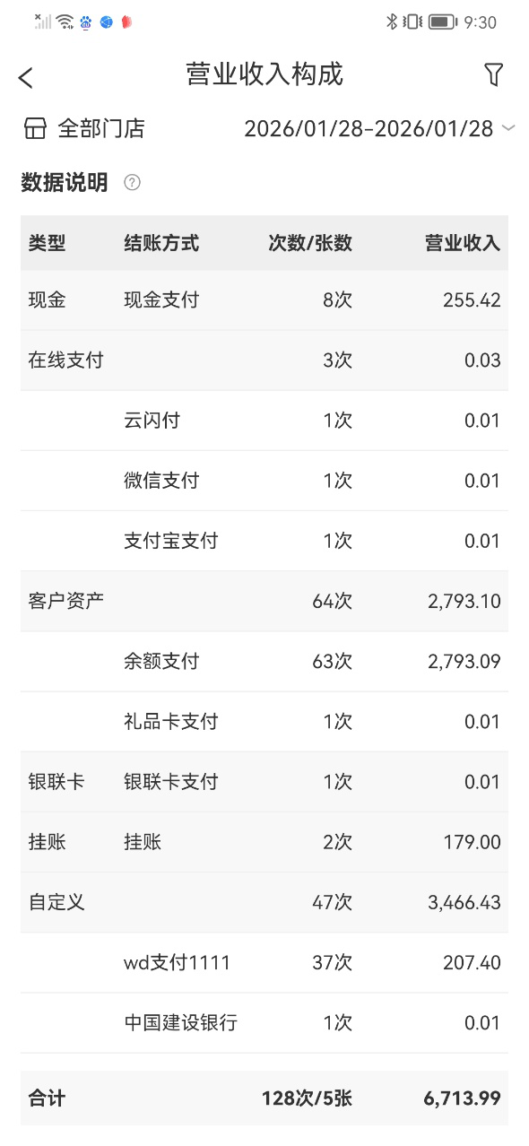 2.APP营业报表增加营业收入构成,统计支付方式和优惠方式中计入实收的数据。