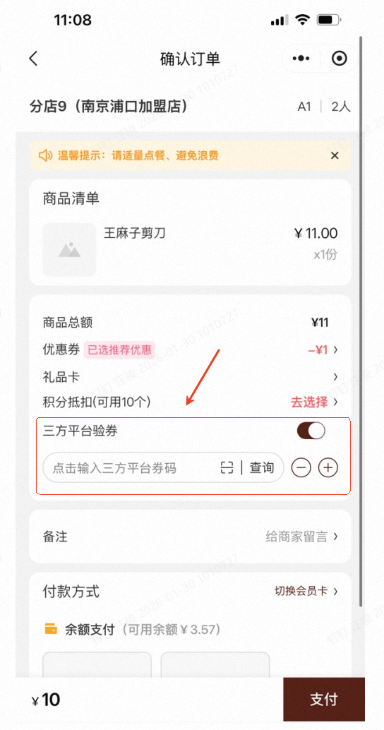 微信小程序堂食点单(先付费模式)输入三方平台券码验券。