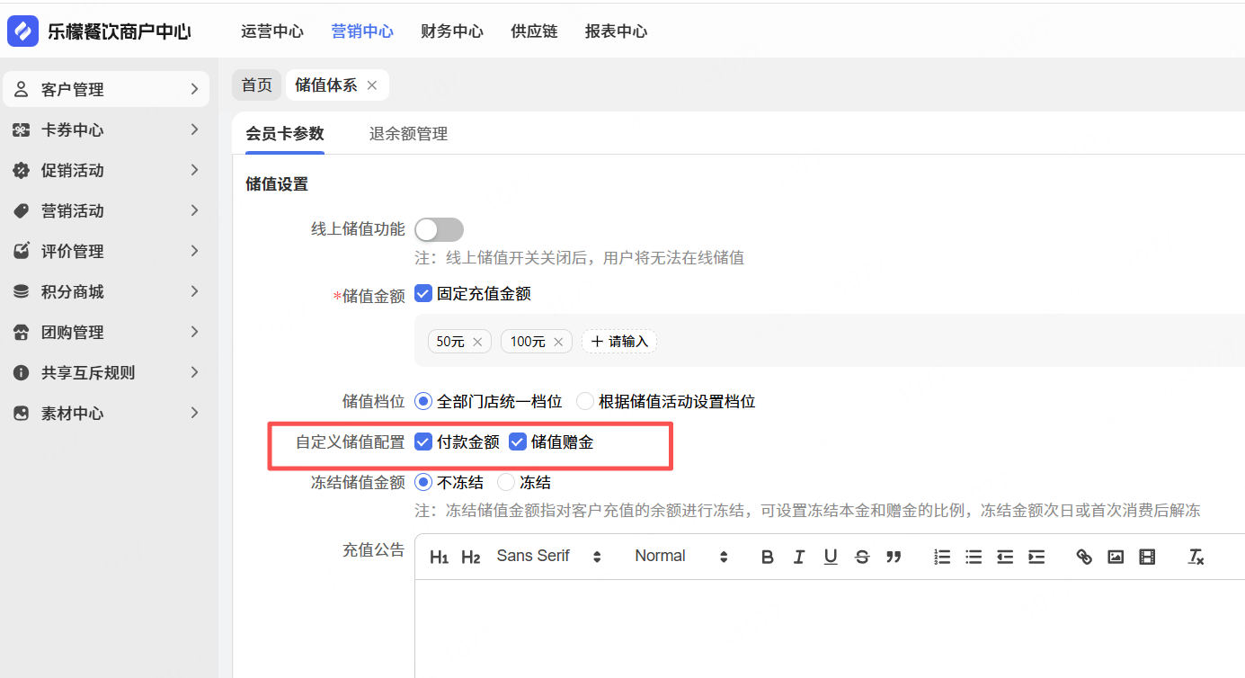 路径:网页后台-营销中心-客户管理-储值体系