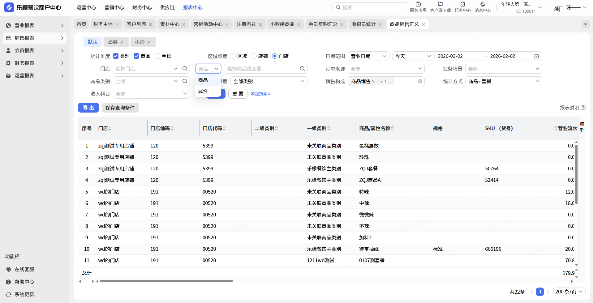 4商品销售汇总,选择商品和属性组件调整,支持弹框选择商品套餐。