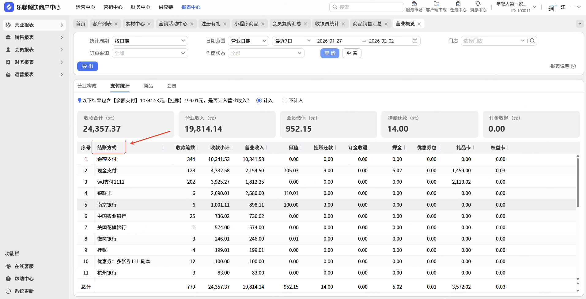 系统的结账方式包含支付方式和优惠方式,其中优惠方式的商品次卡以及优惠券也是可以计入收入的,以下报表的列表标题根据实际情况展示为结账方式。