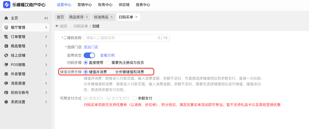 网页-餐厅管理-扫码买单,增加储值消费步骤选项