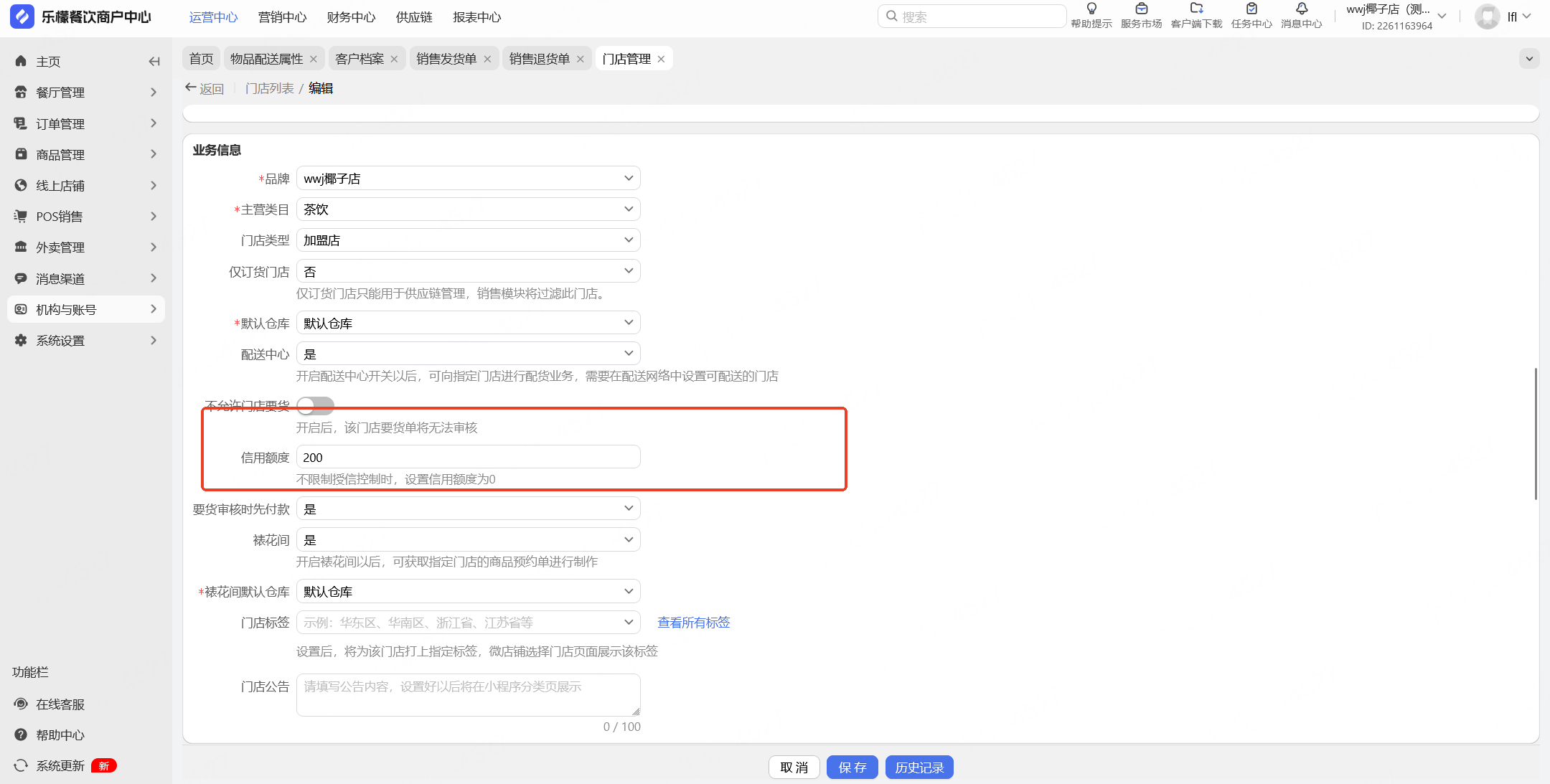 总部可设置加盟店的信用额度,为0时不受授信控制