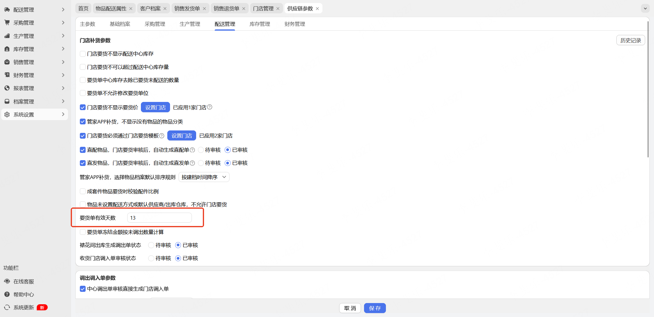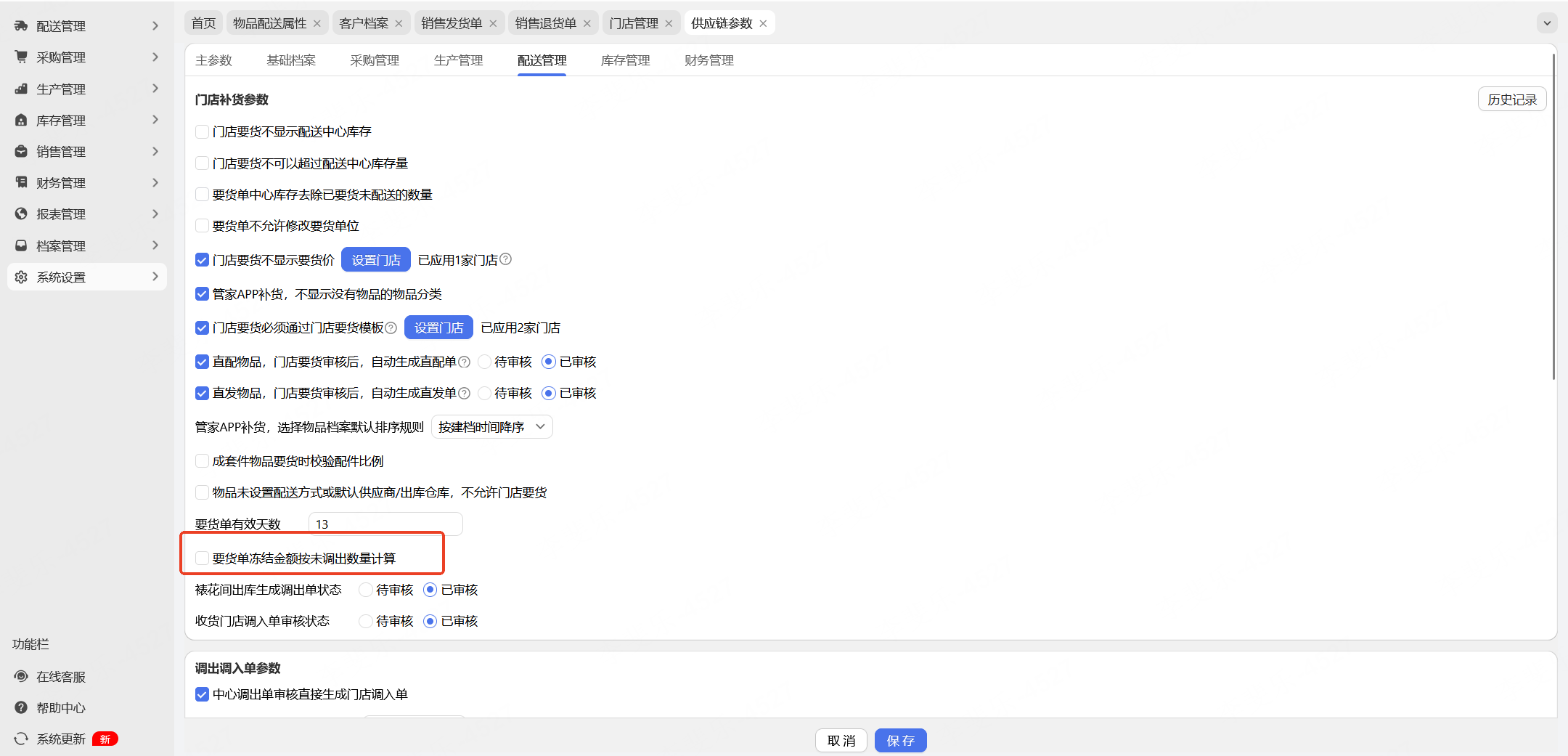 增加冻结金额概念,冻结金额=有效期内的要货单未转成调出单的部分,根据“要货单冻结金额按未调出数量计算”参数(路径:供应链-系统设置-供应链参数-配送管理)判断
