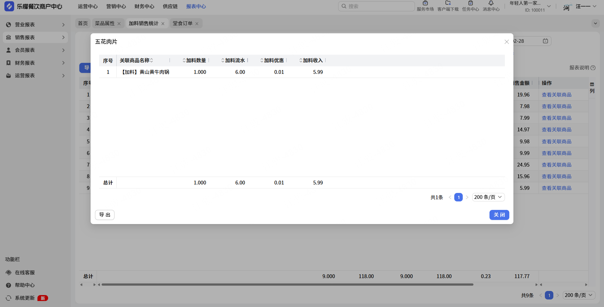 2.针对加料销售,可查看关联商品,了解具体哪些商品下单了该种加料。