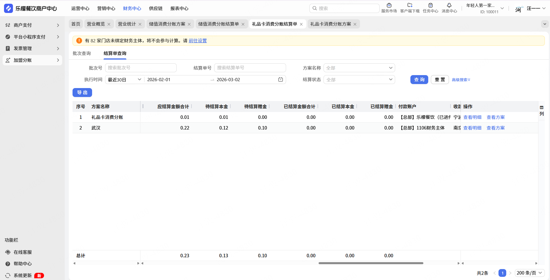 2.礼品卡分账结算单-结算单查询中,增加列:待结算本金、待结算赠金、已结算本金、已结算赠金。