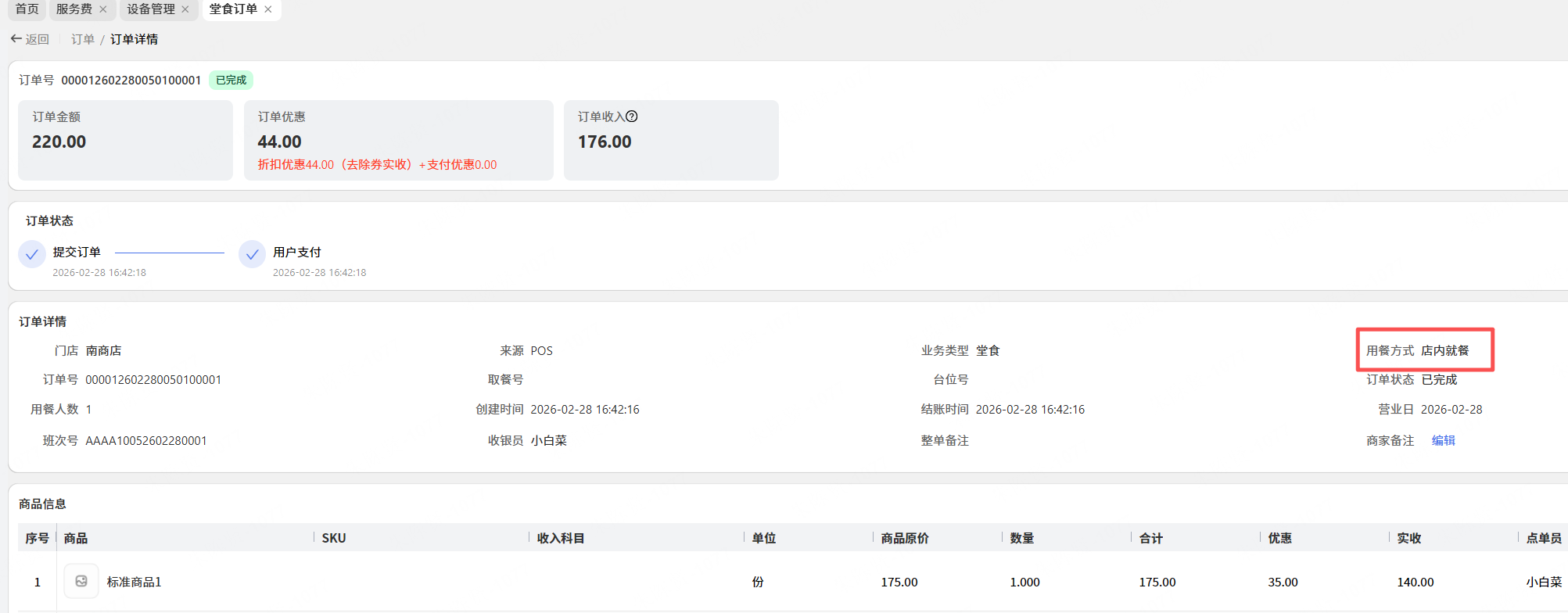 【全POS】堂食订单中用餐方式显示