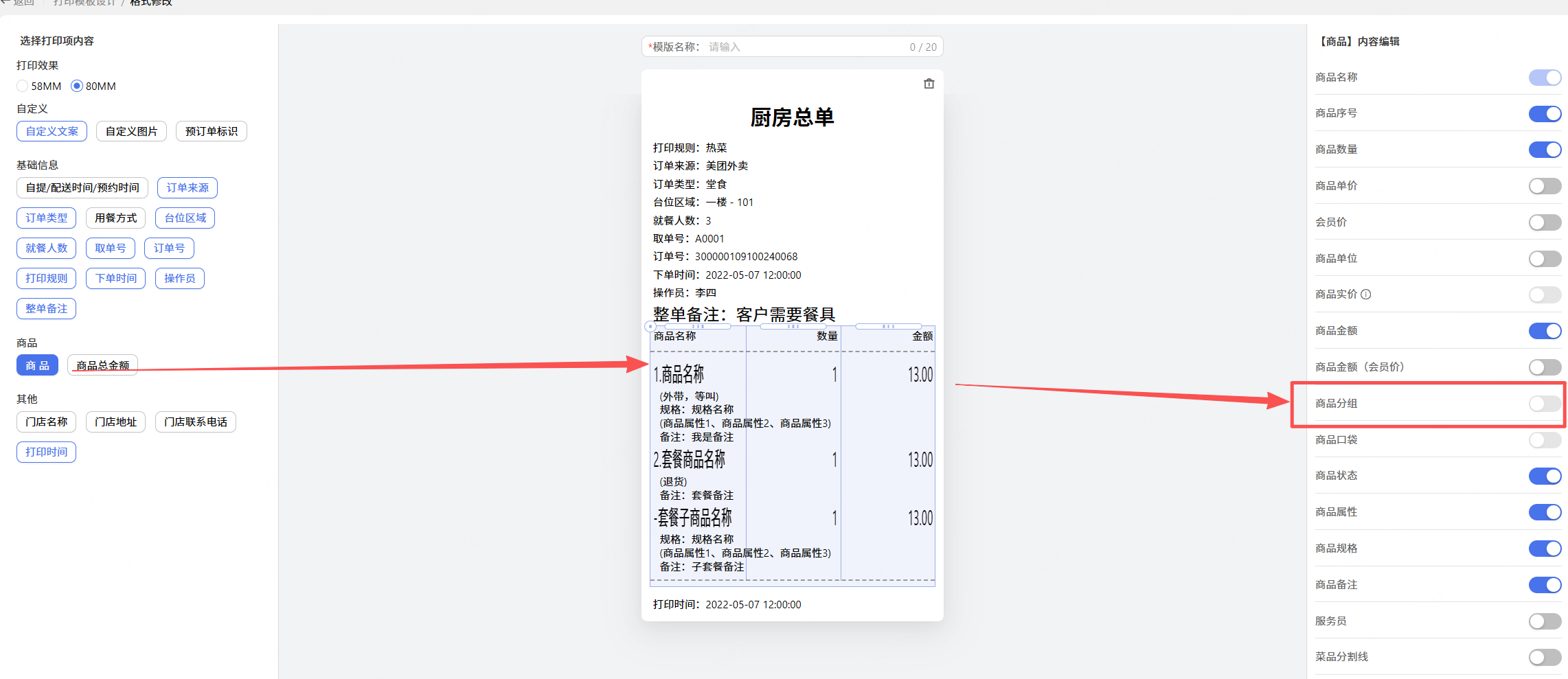 10.【网页】票据样式设置中后厨单相关的商品字段字段控制