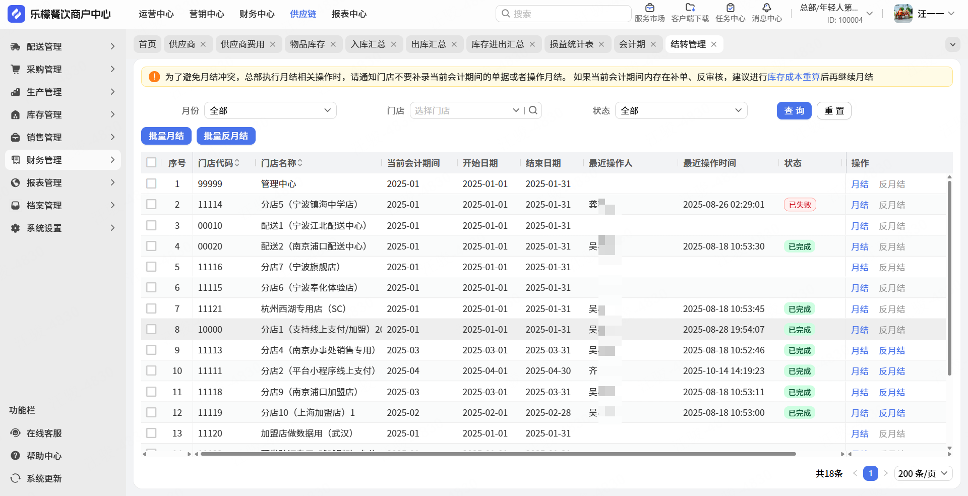 为了避免月结冲突,总部执行月结相关操作时,请通知门店不要补录当前会计期间的单据或者操作月结。 如果当前会计期间内存在补单、反审核,建议进行