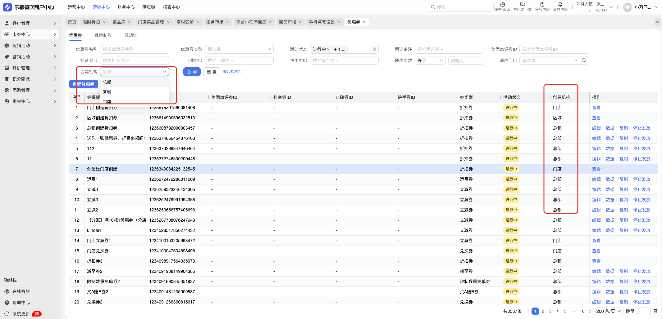 总部视角:默认创建机构全部,适用门店为全部,可选所有门店