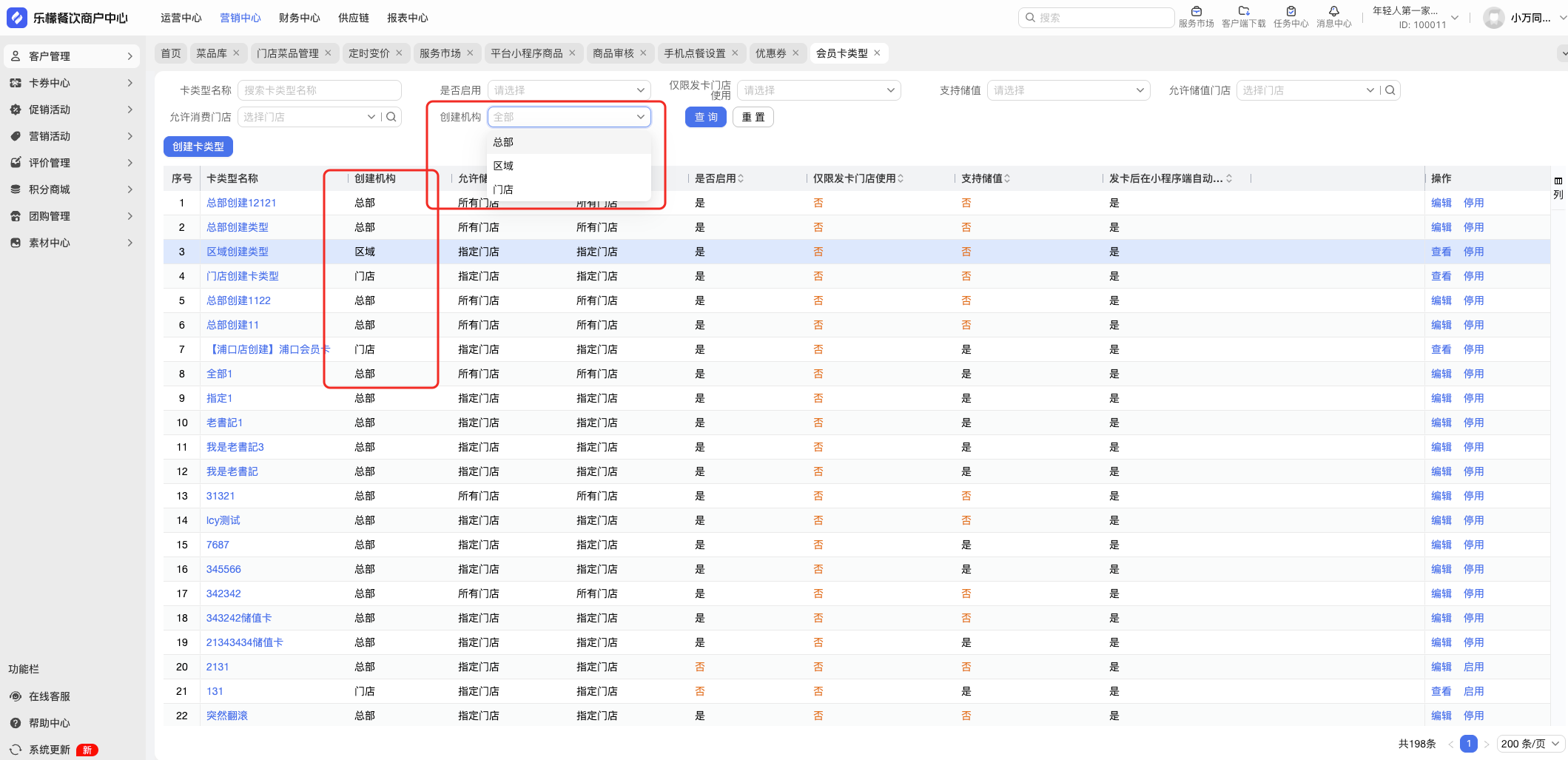 总部视角:默认创建机构全部,允许储值门店和允许消费门店为全部,可选所有门店