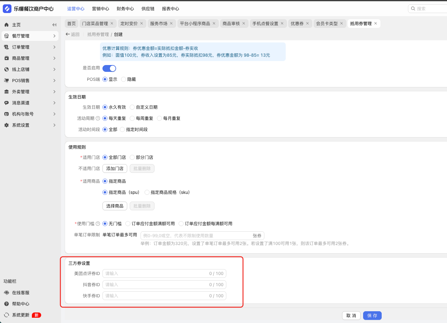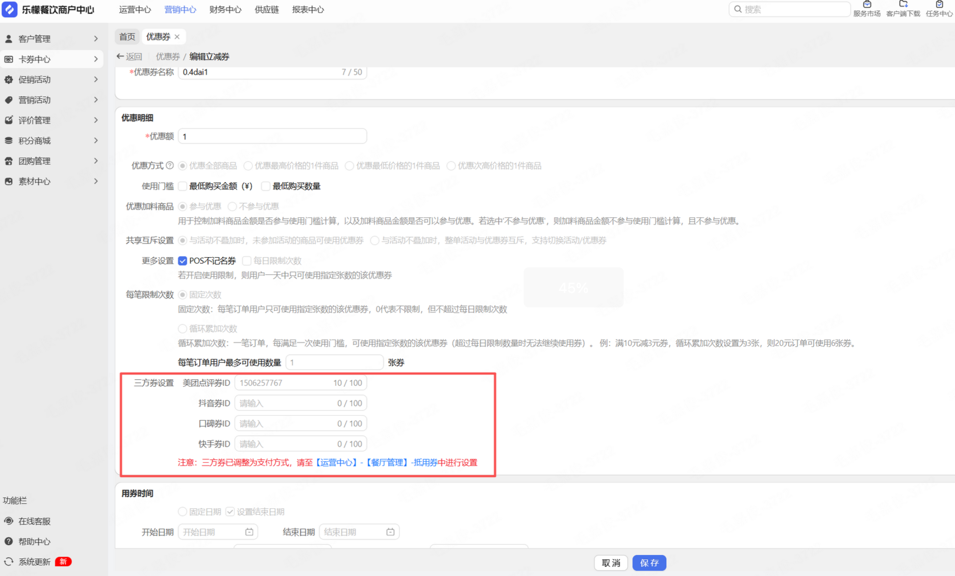 新的三方券已调整为支付方式,请至【运营中心】-【餐厅管理】-抵用券中进行设置