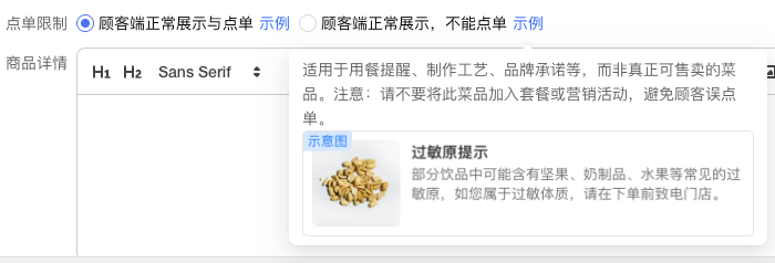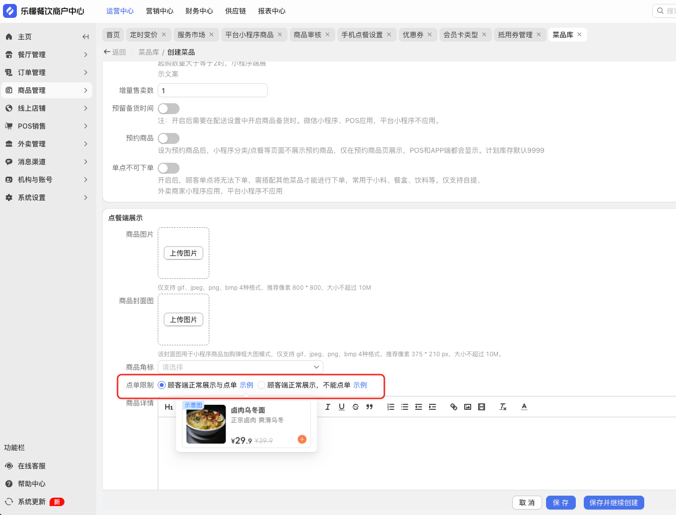 原“展示商品”,改为:点单限制。位置移到菜品详情上面;默认:顾客端正常展示与点单。