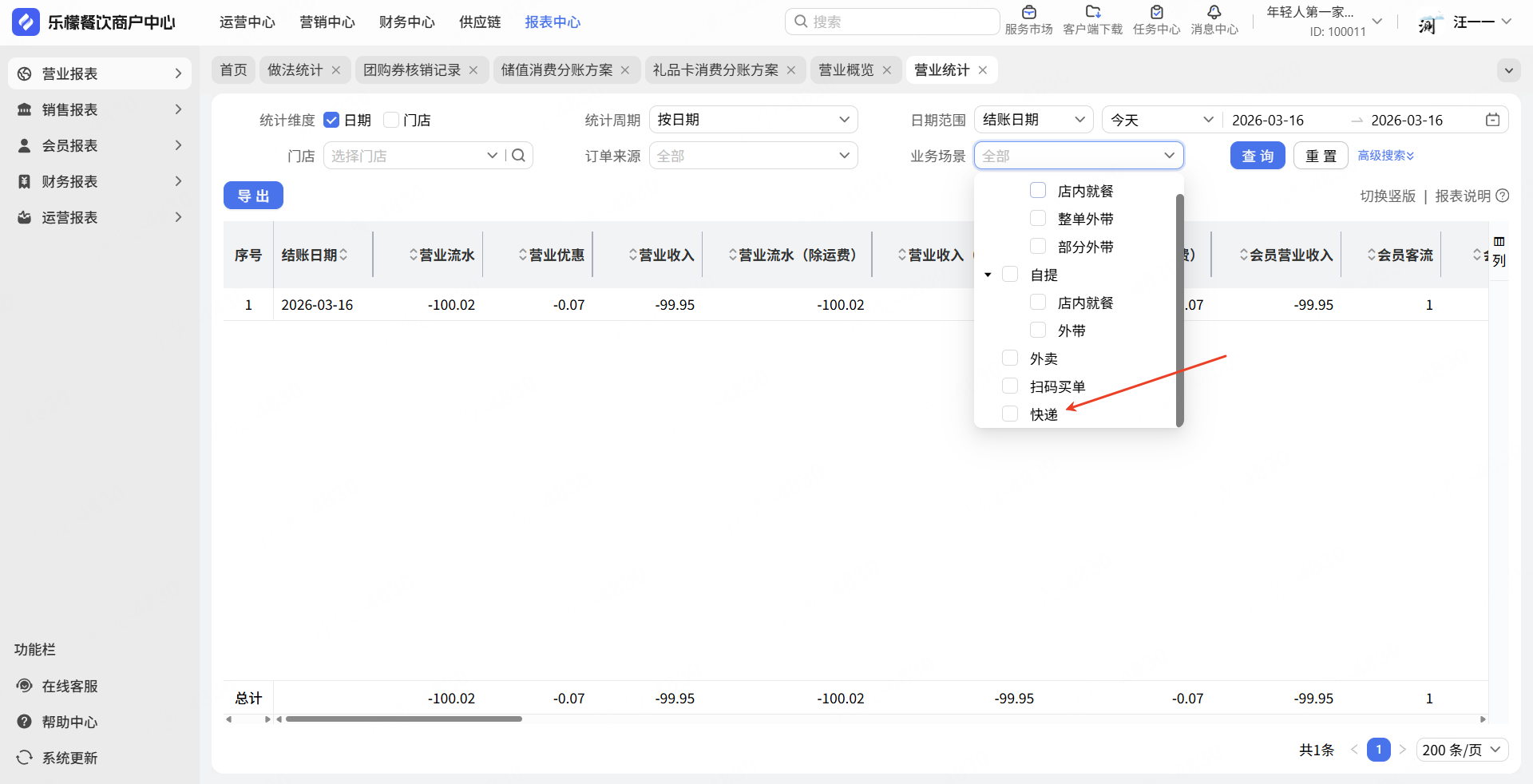 报表业务场景,增加快递筛选。由于目前只支持总部快递不支持门店快递,所以只有总部视角可以查到快递类型的数据。
