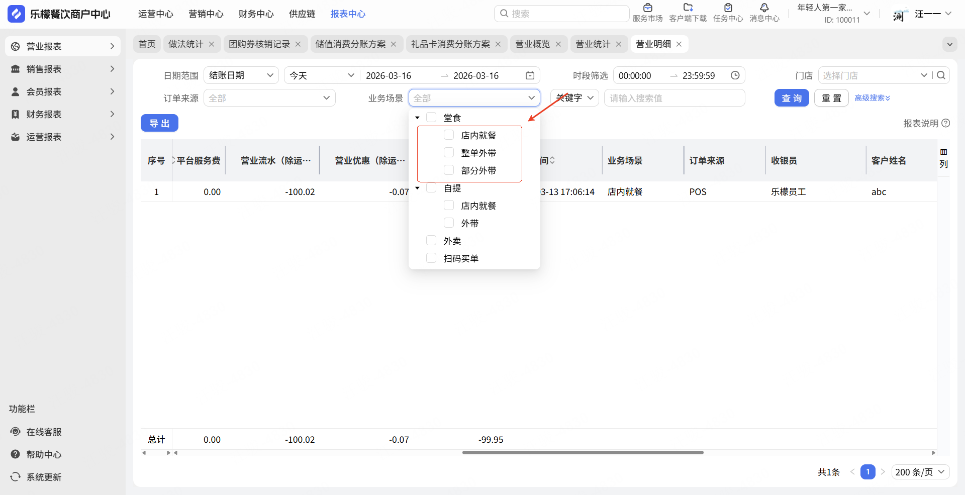 1.2针对营业类报表,业务场景的堂食细分,分为:店内就餐、整单外带、部分外带。商品类报表对堂食类型不做拆分。