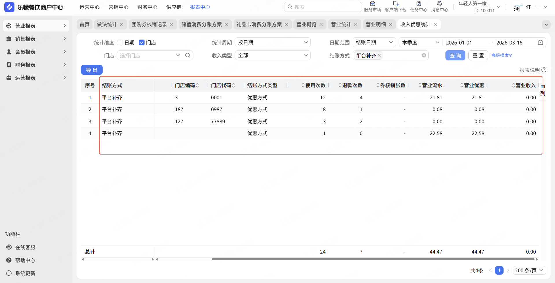 3.收入优惠统计中的平台补齐数据与营业概览中的数据统计规则调整一致。