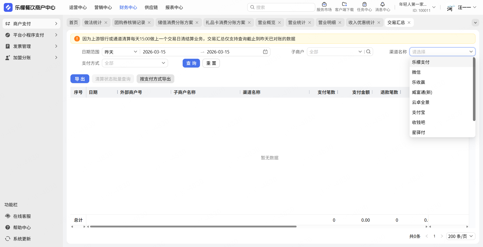 5.交易汇总的渠道名称搜索,与渠道配置数据保持一致。