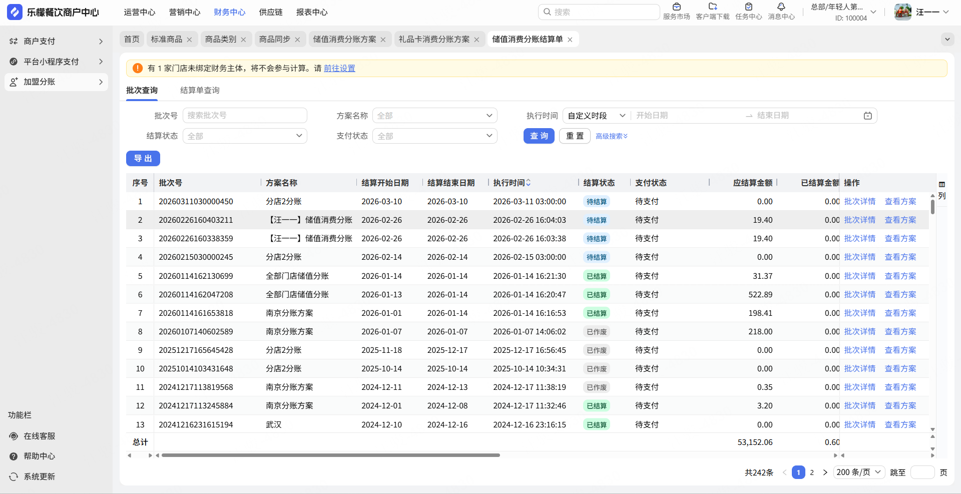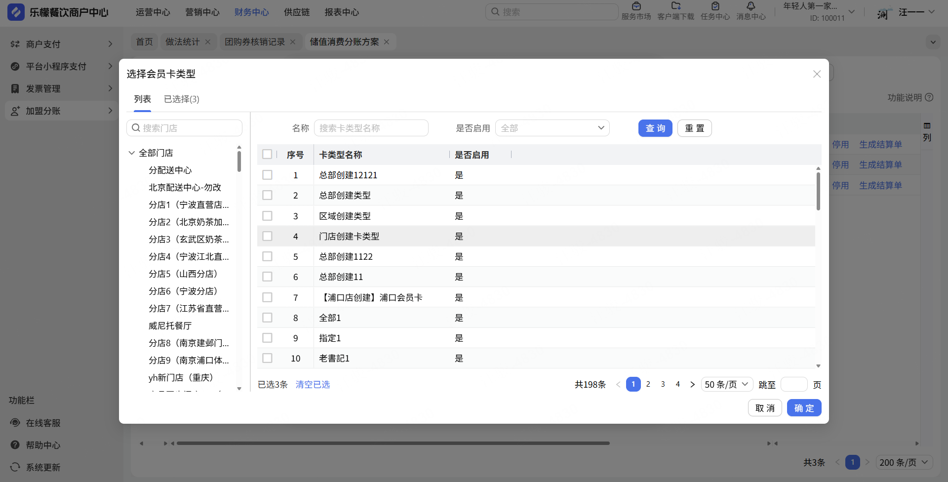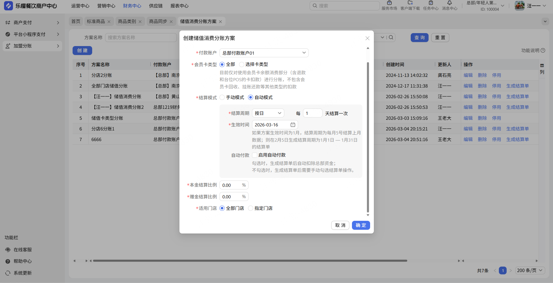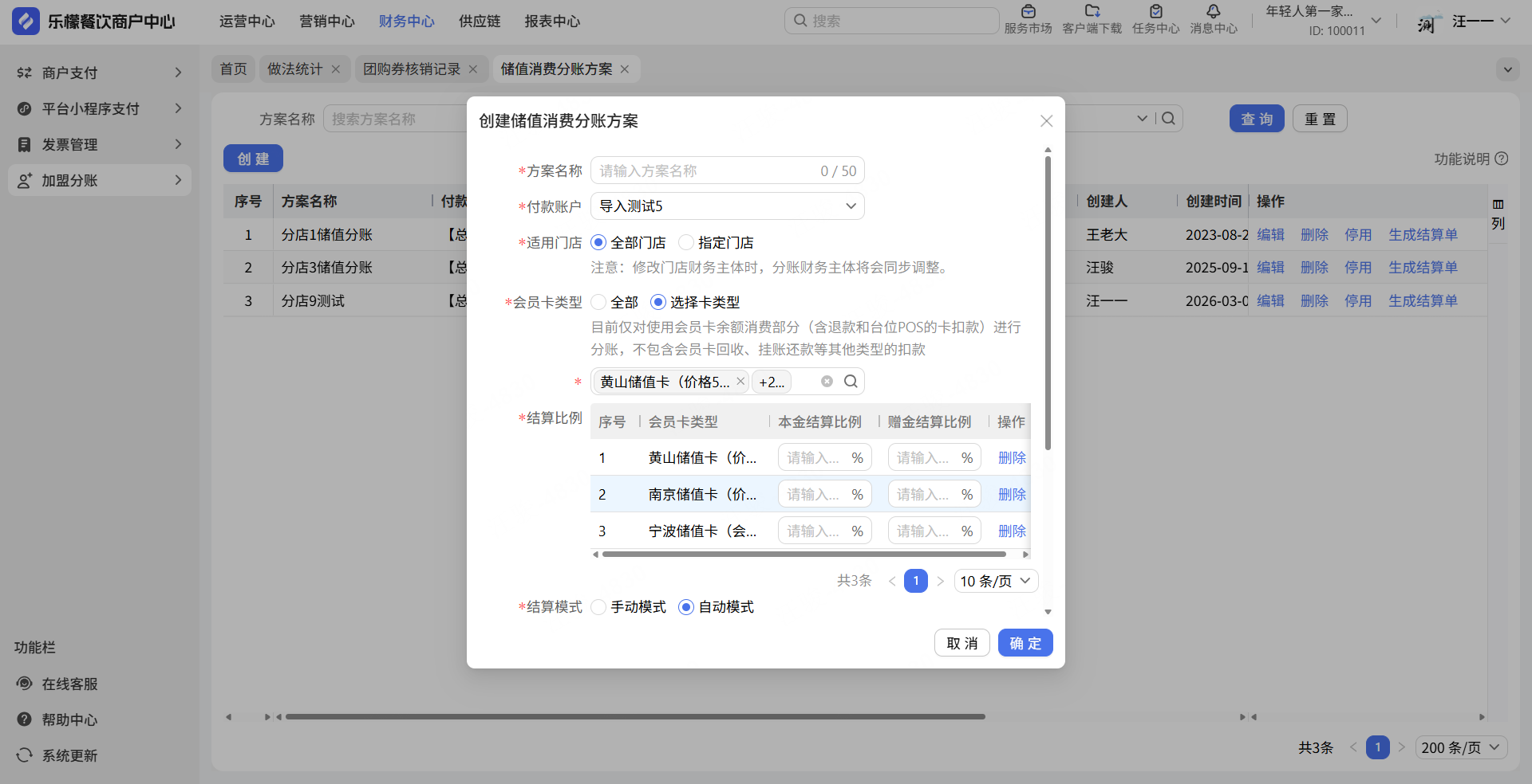 1.储值消费分账支持不同卡类型不同分账比例。适用门店和结算比例的位置调整,方便商家设置。