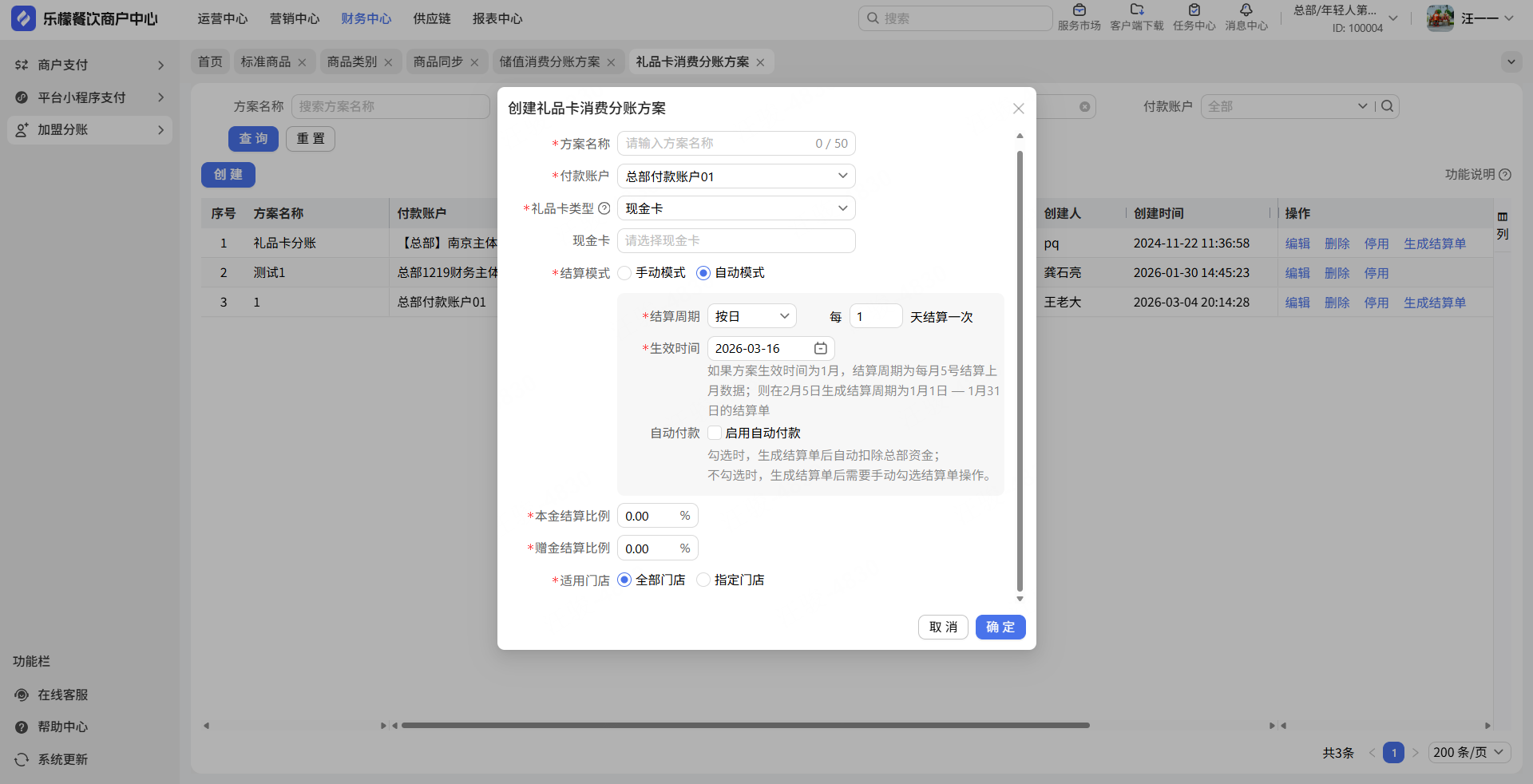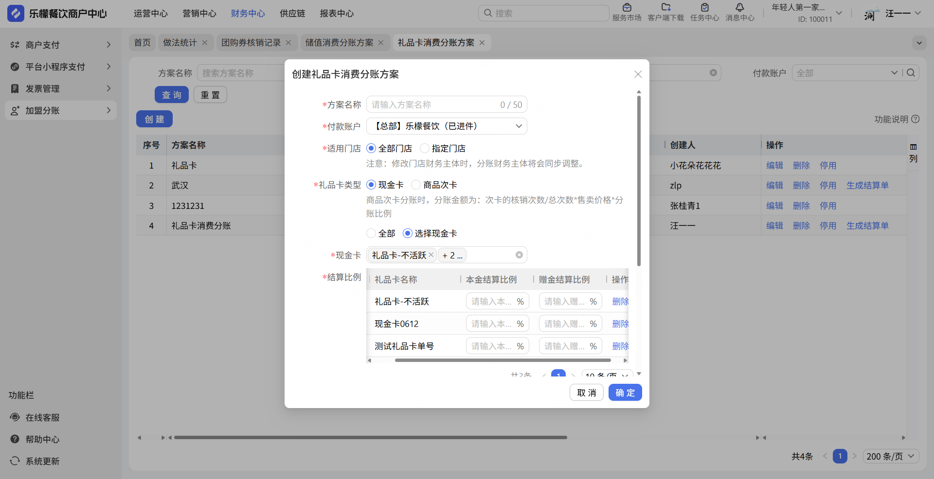 2.礼品卡消费分账支持不同卡类型不同分账比例。适用门店和结算比例的位置调整,方便商家设置。