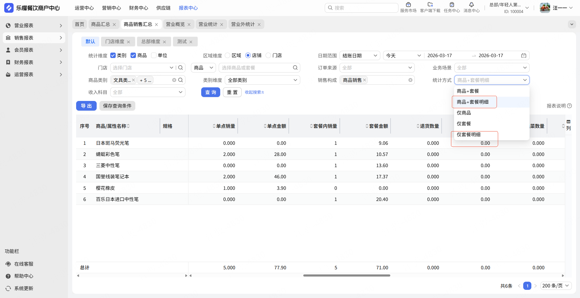 只有筛选【商品+套餐明细】和【仅套餐明细】时,才会统计套餐内销量和套餐金额