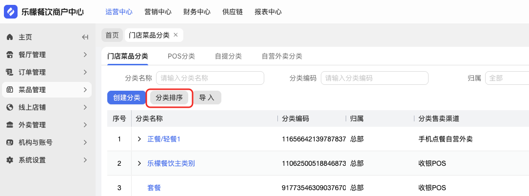 原商品排序-总部排序(一级类别排序和二级类别排序),功能移到菜品分类-分类排序