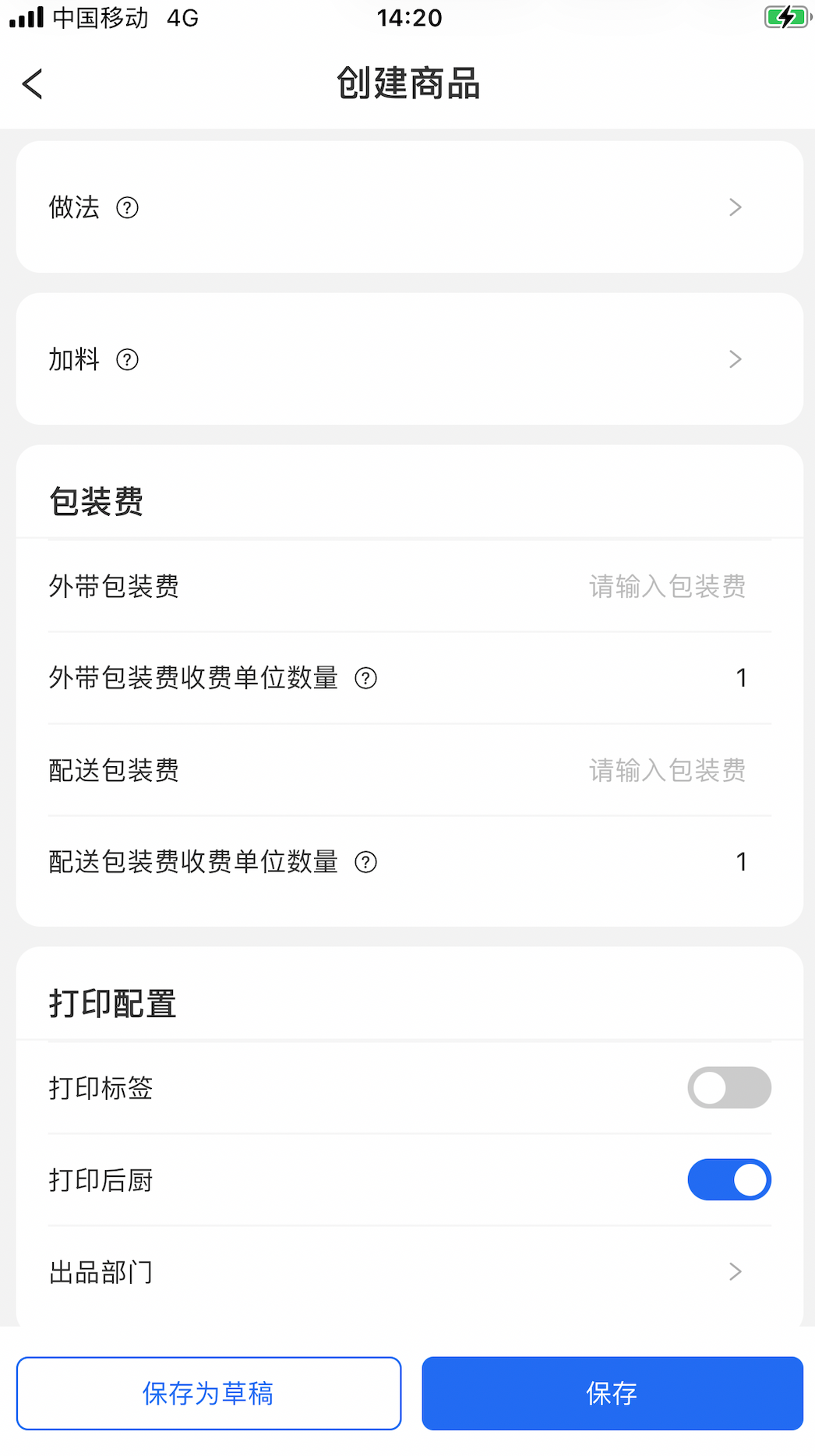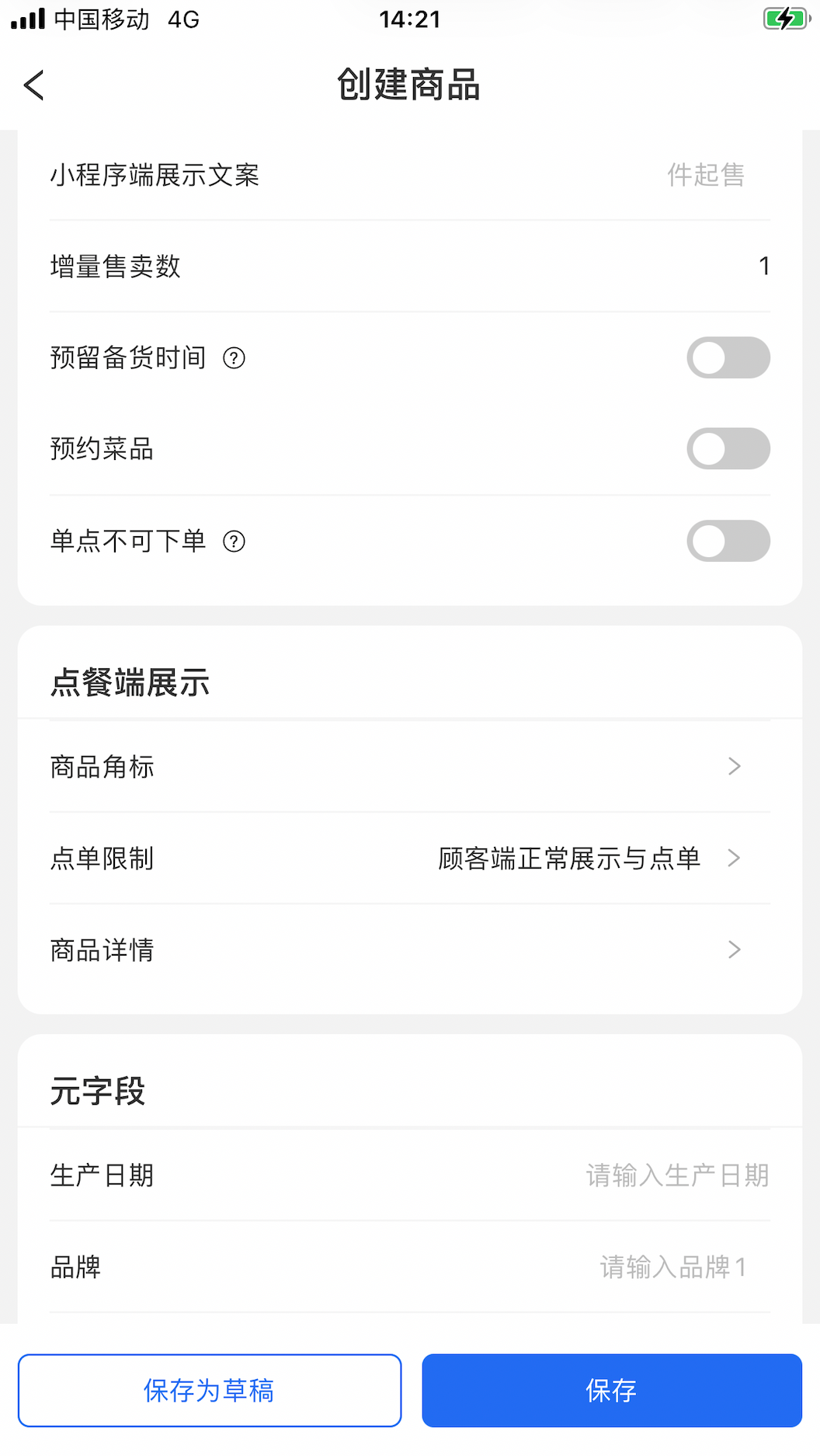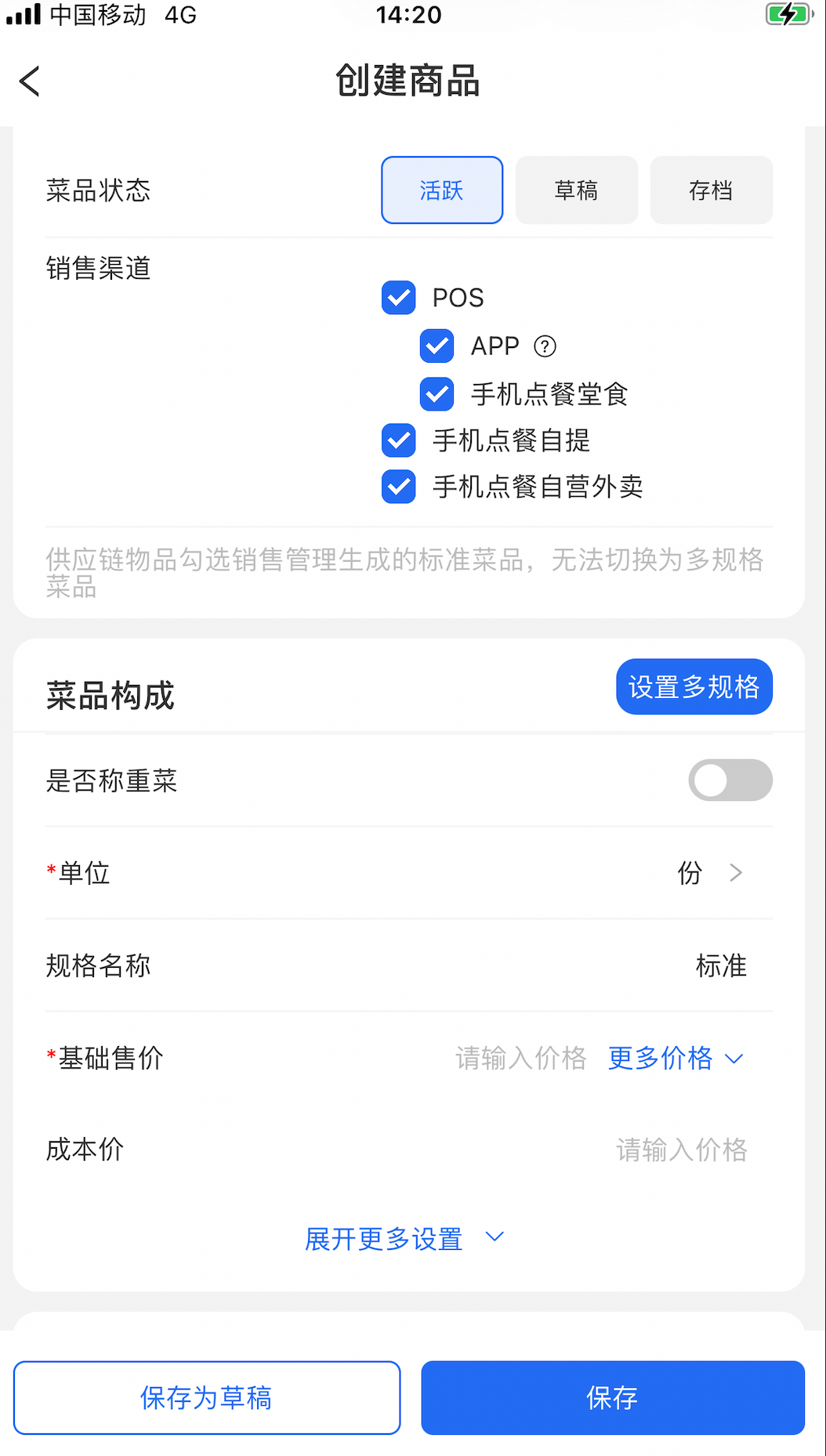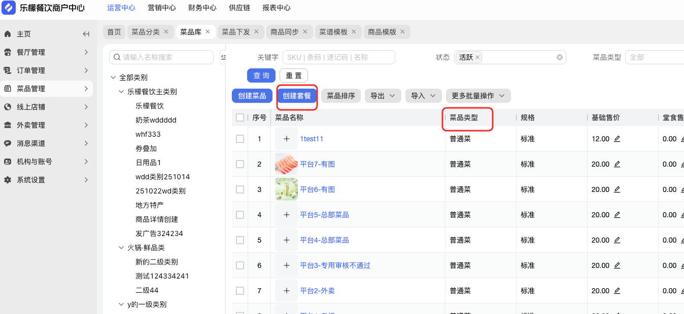 增加来源、菜品类型、有无规格、有无做法、加料显示,门店视角下,如果是门店自建菜品则不显示来源;