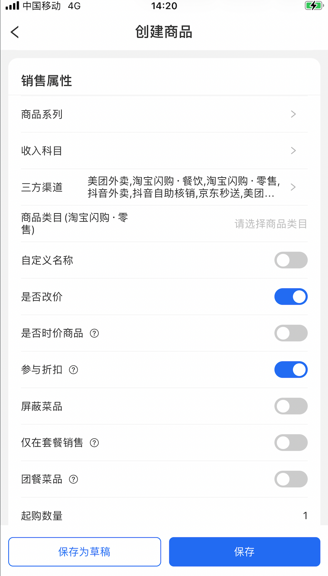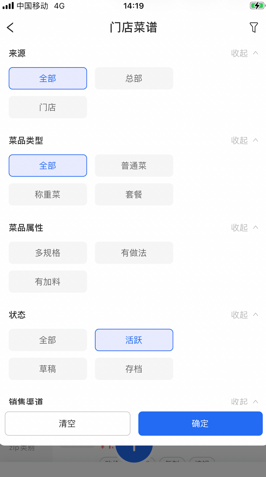 筛选条件,增加来源、菜品类型、菜品属性、状态、销售渠道;