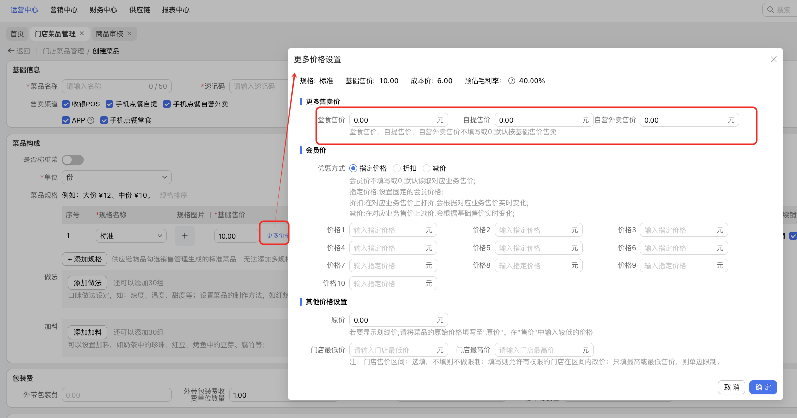 菜品库菜品、门店菜谱、套餐商品、门店套餐商品,增加更多价格设置,