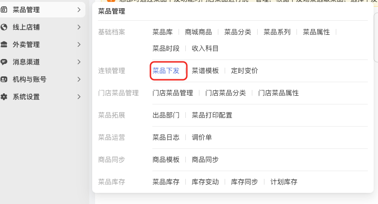 菜品管理-连锁管理,新增“菜品下发”功能
