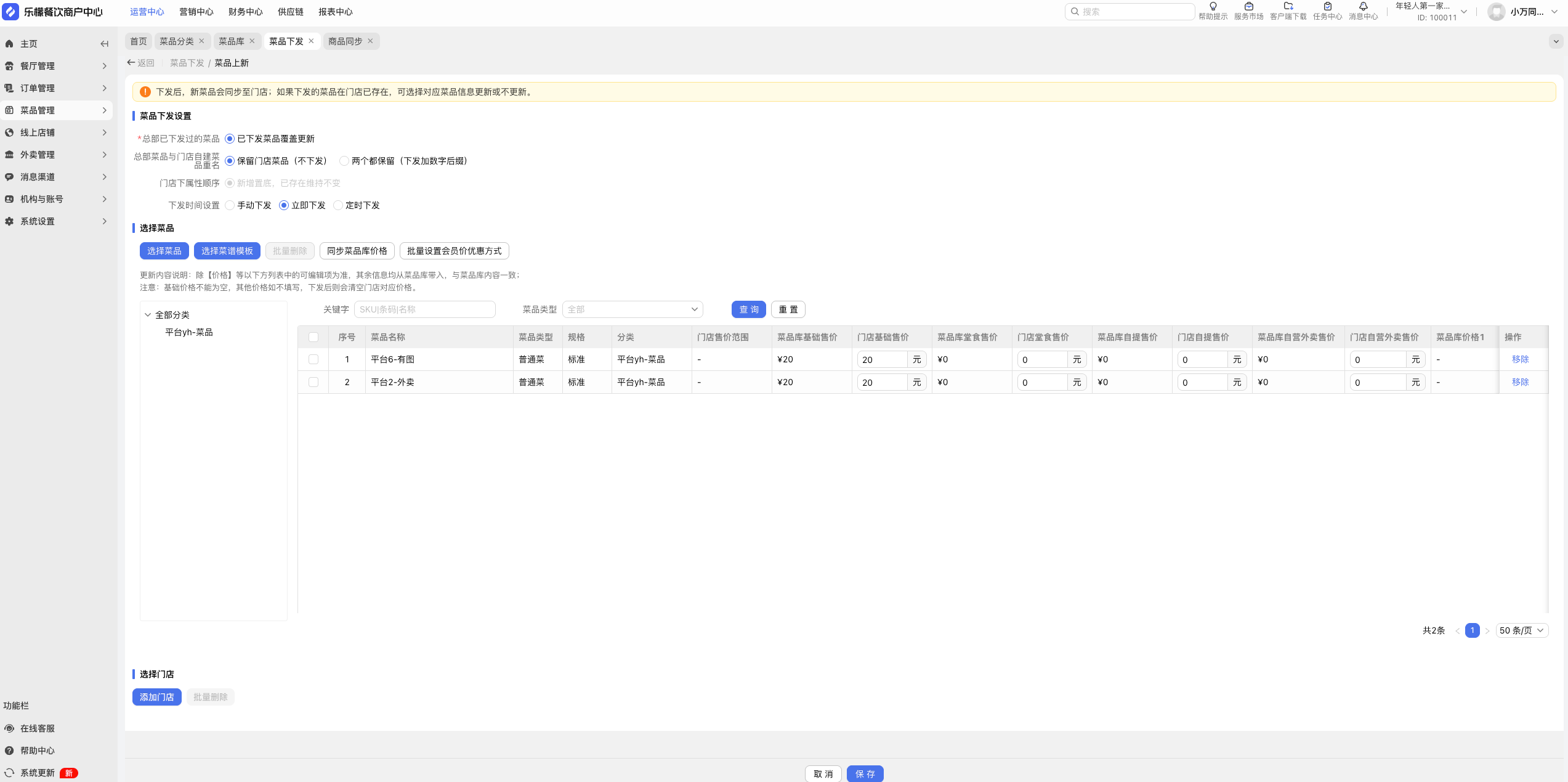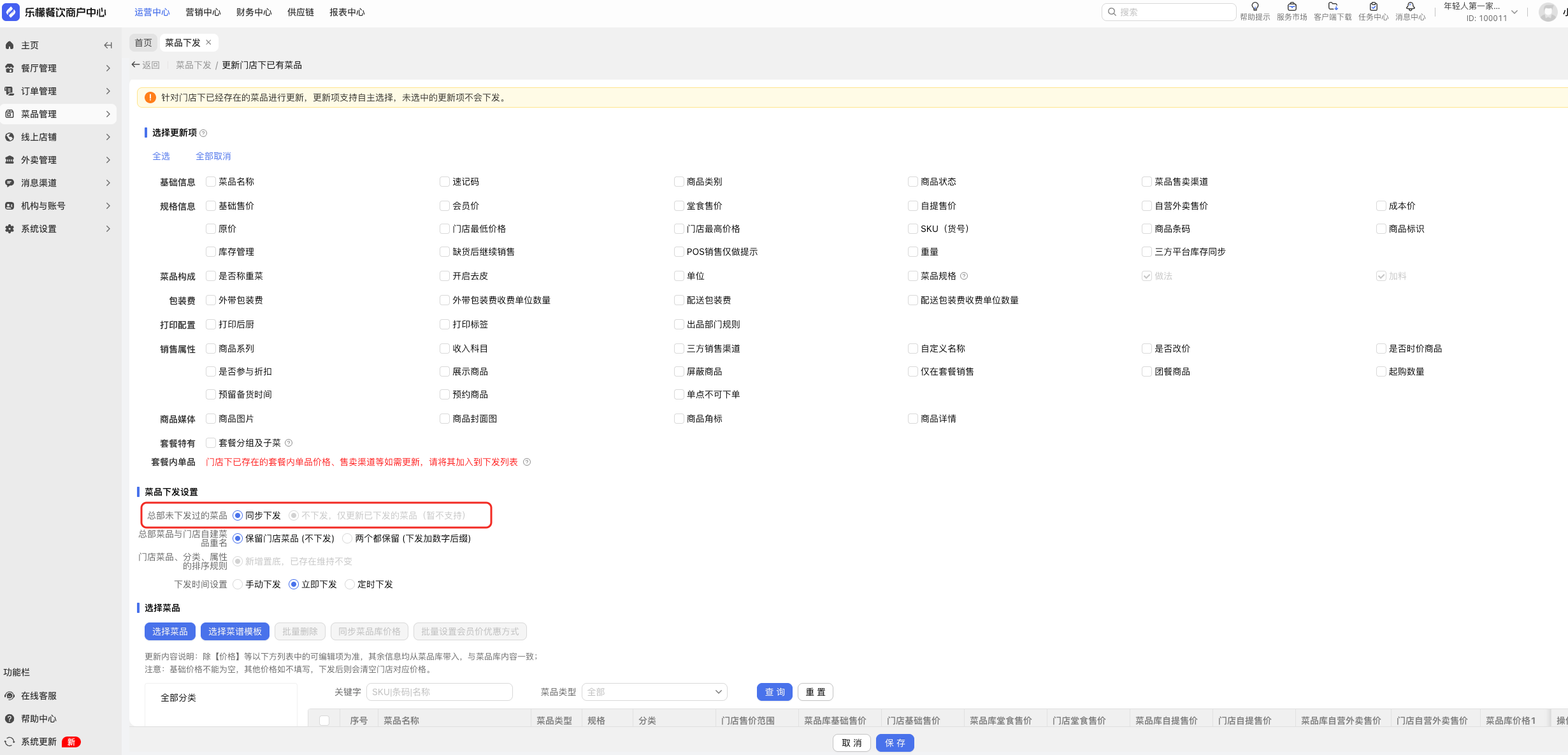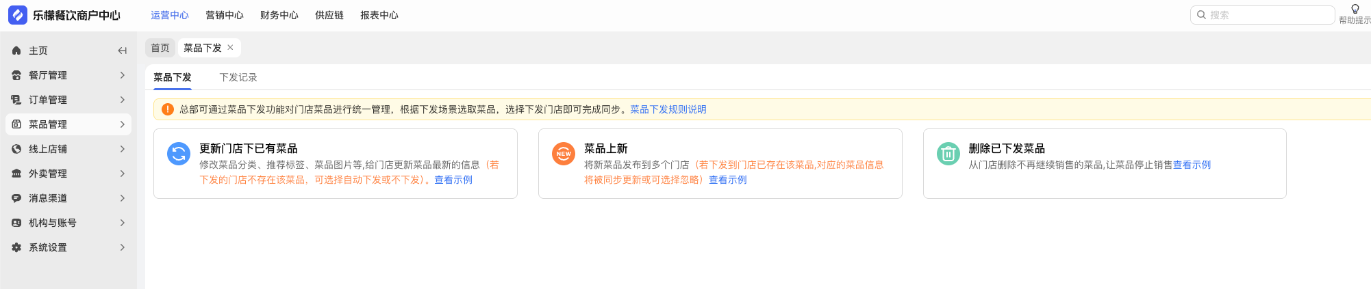 【运营中心】菜品下发功能
