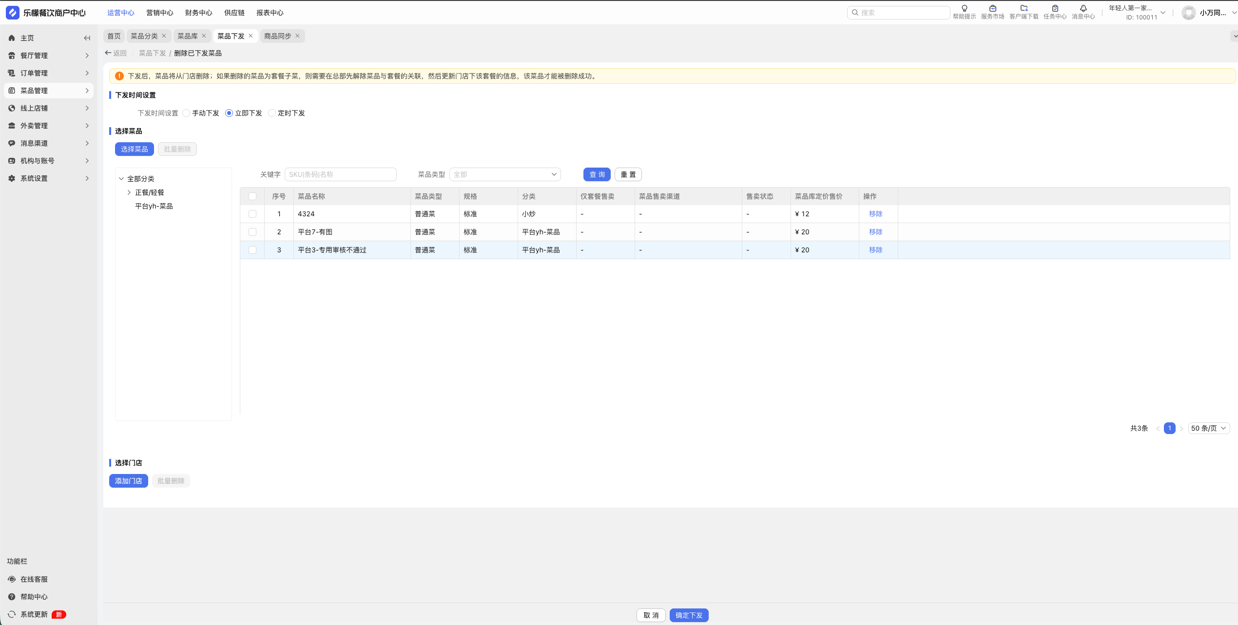 使用场景:某些菜品不再销售,总部从门店删除不再销售的菜品。