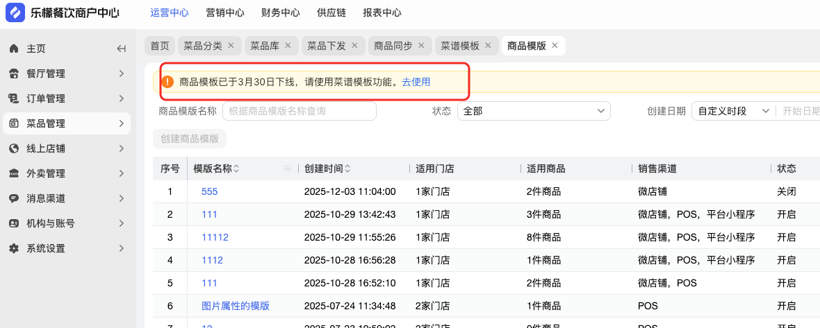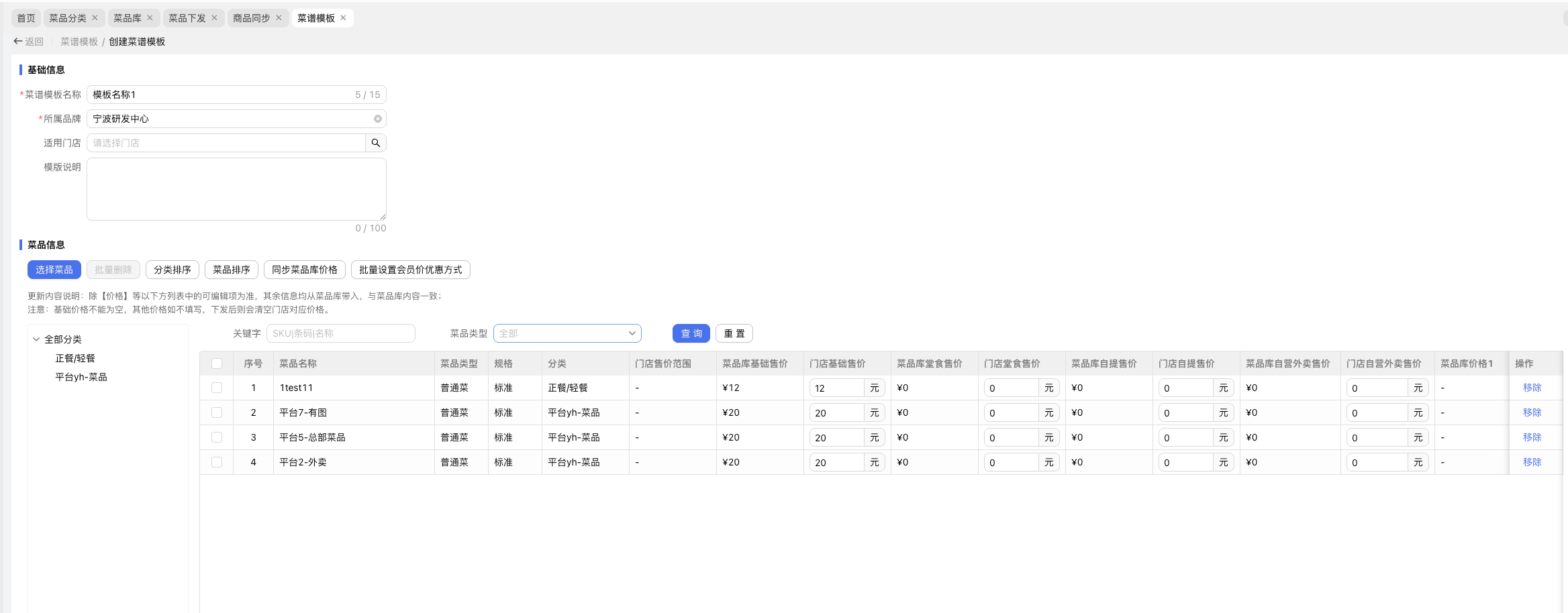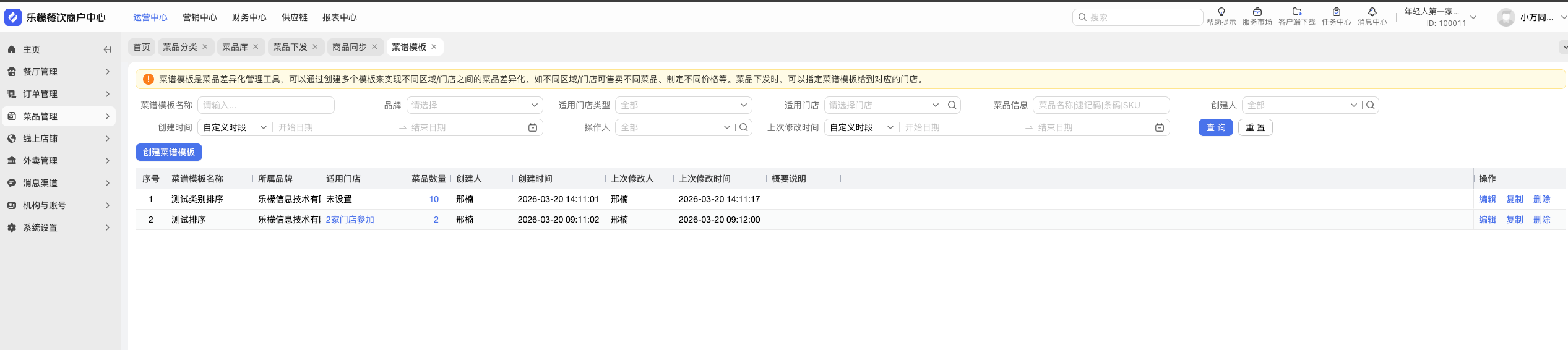 菜谱模板:是菜品差异化管理工具,可以通过创建多个模板来实现不同区域/门店之间的菜品差异化。如不同区域/门店可售卖不同菜品、制定不同价格等。菜品下发时,可以指定菜谱模板给到对应的门店。