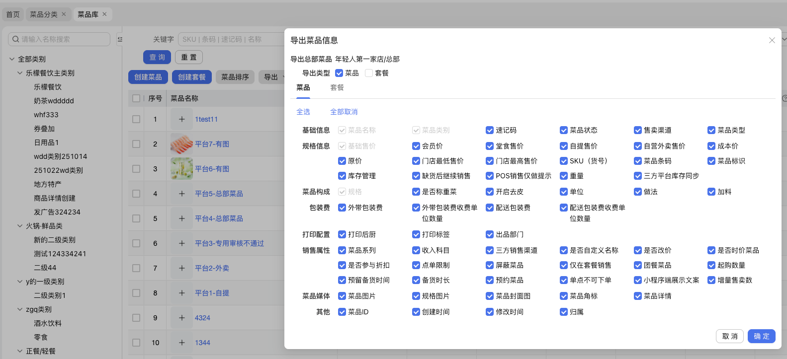 默认全选菜品字段,可根据需要选择需要导出的字段信息。