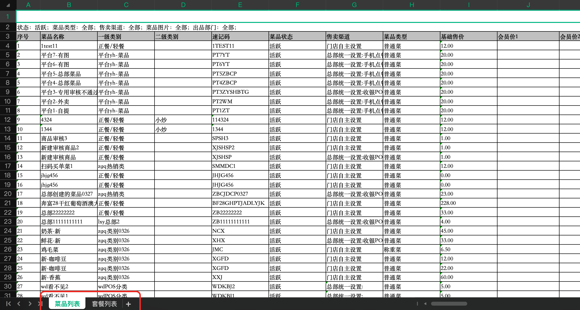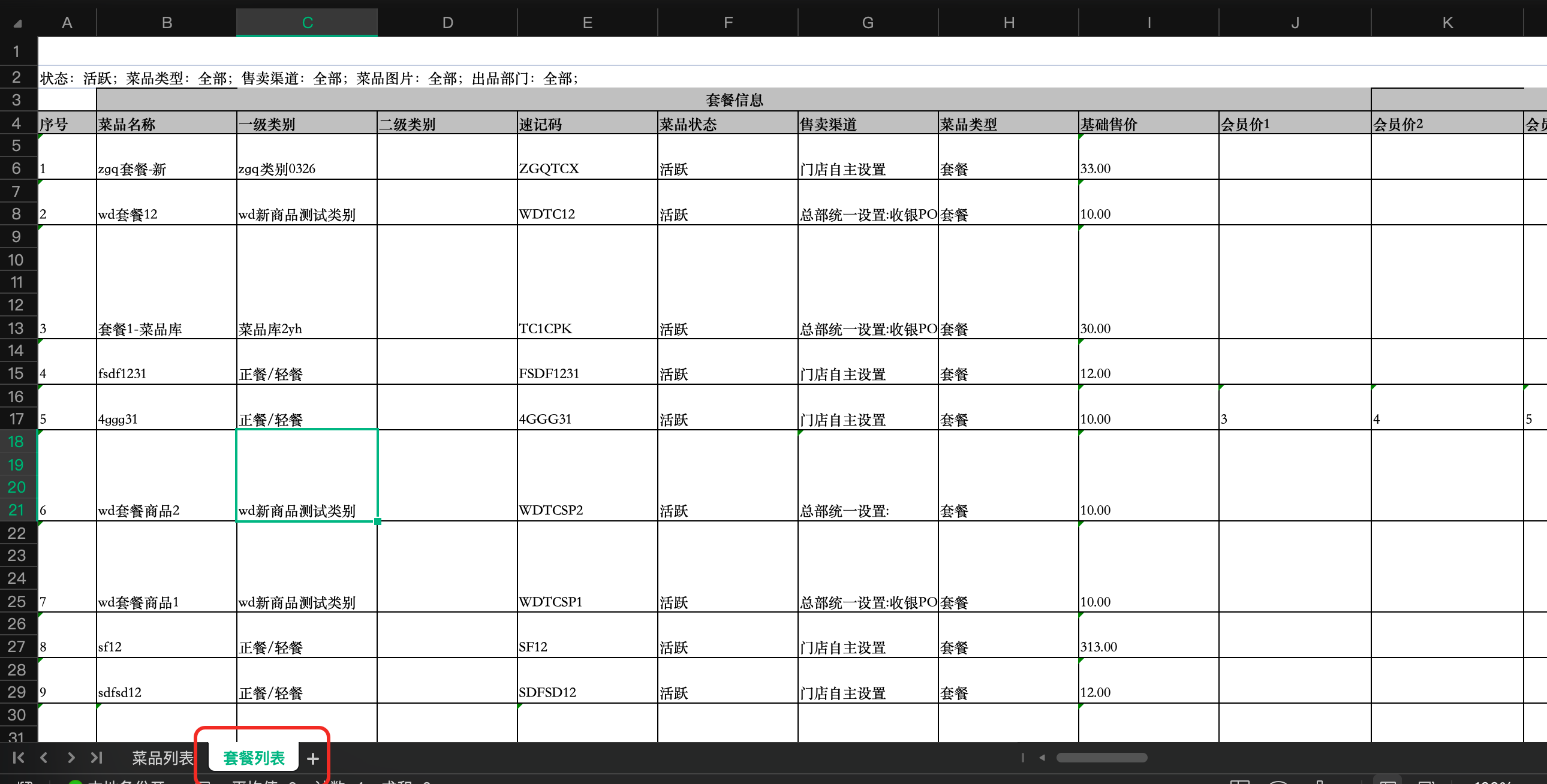 如果同时勾选菜品和套餐,则导出同一个表格文件2个sheet表格(菜品列表和套餐列表)