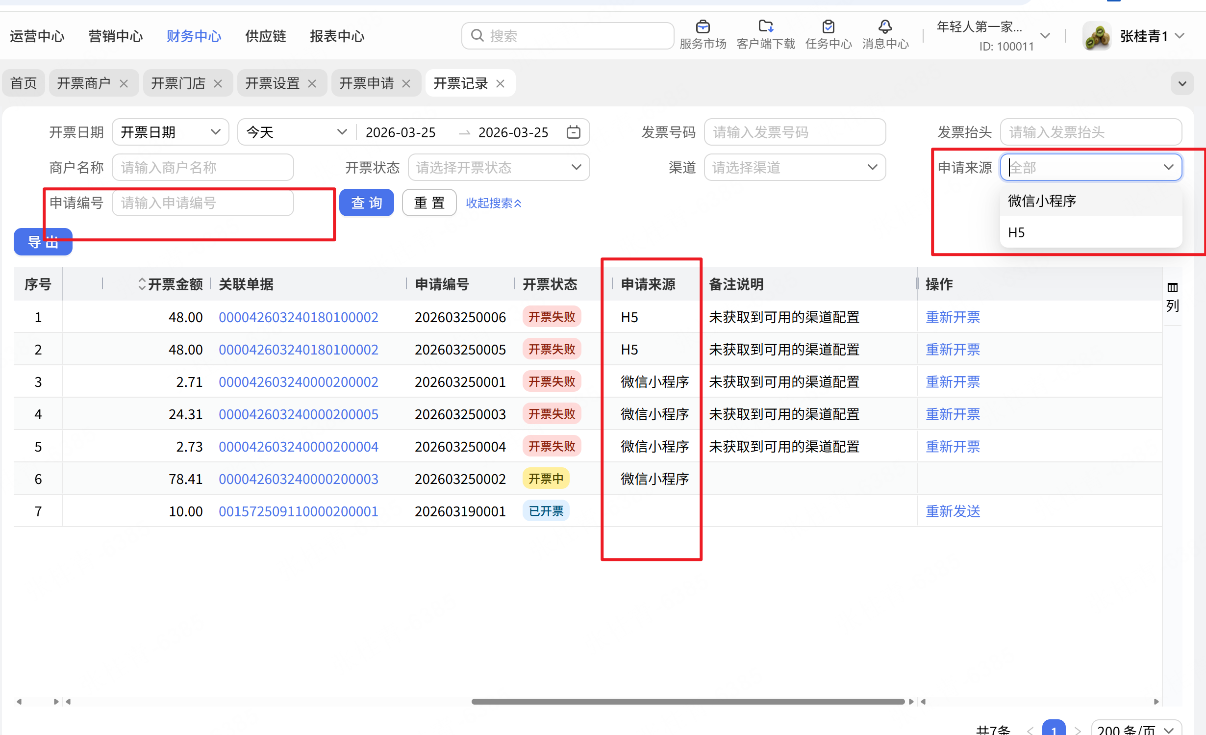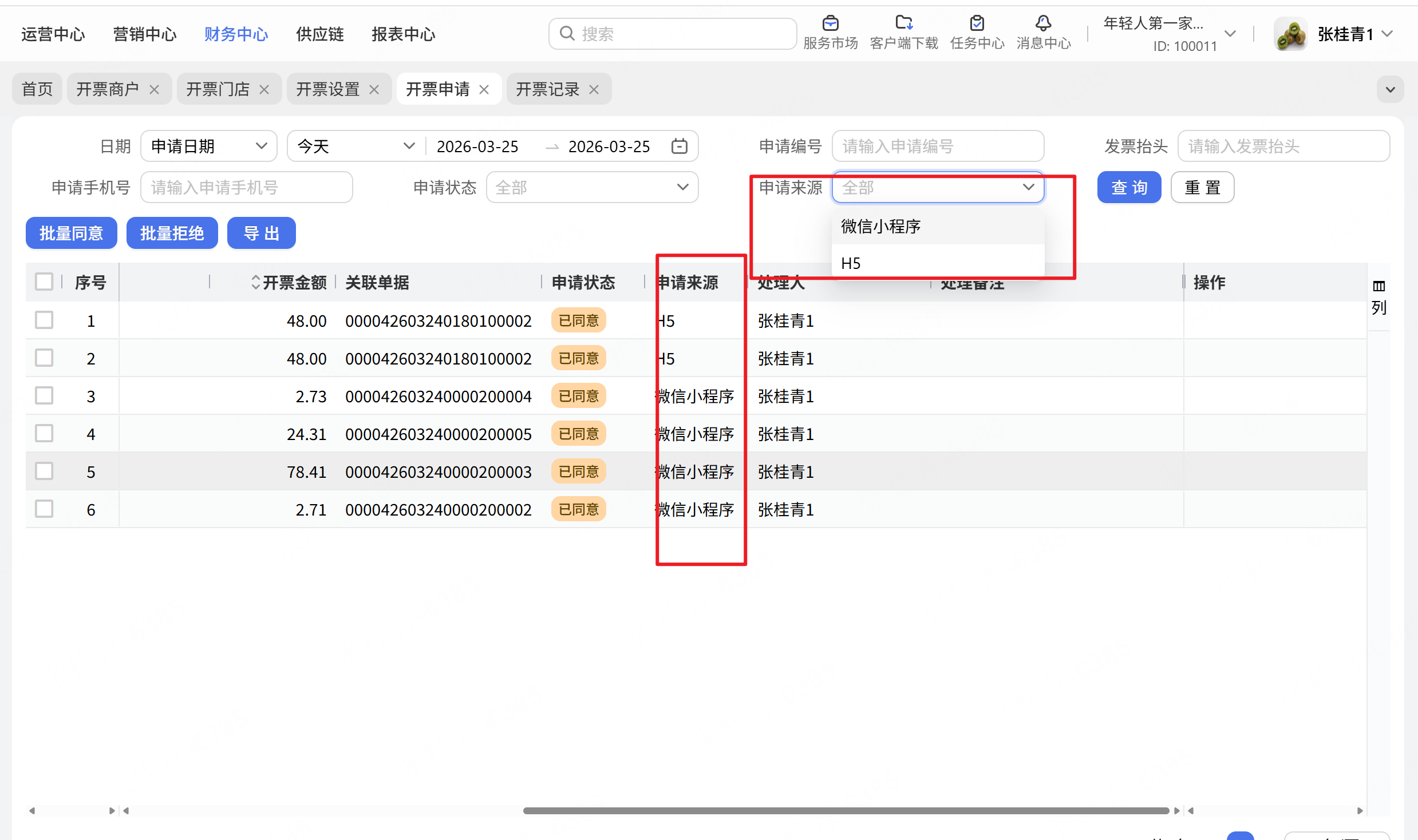 开票申请及开票记录增加筛选项及列展示“申请来源”,展示“微信小程序”及“H5”