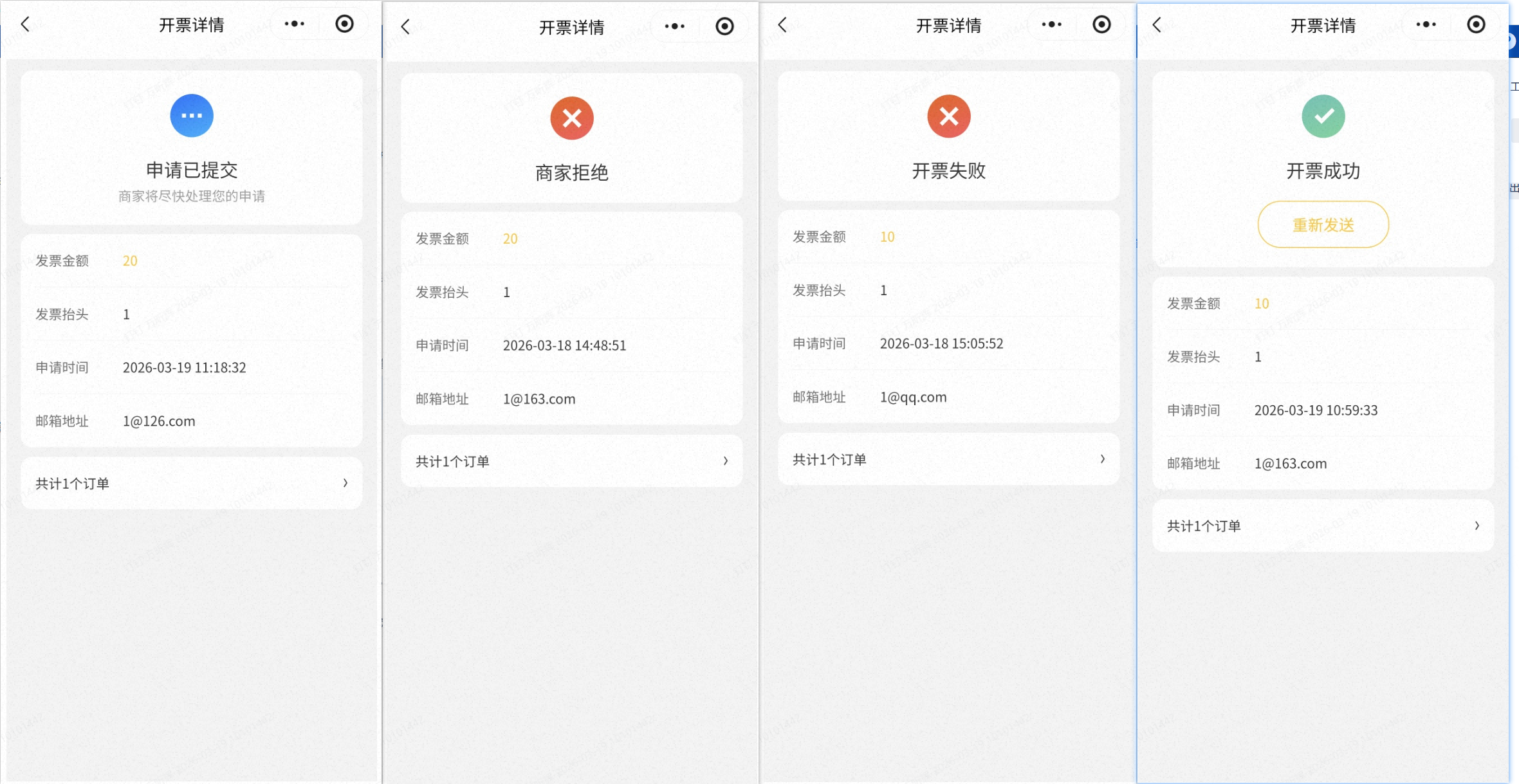 小程序及H5开发票界面,展示所有的开票申请及对应状态