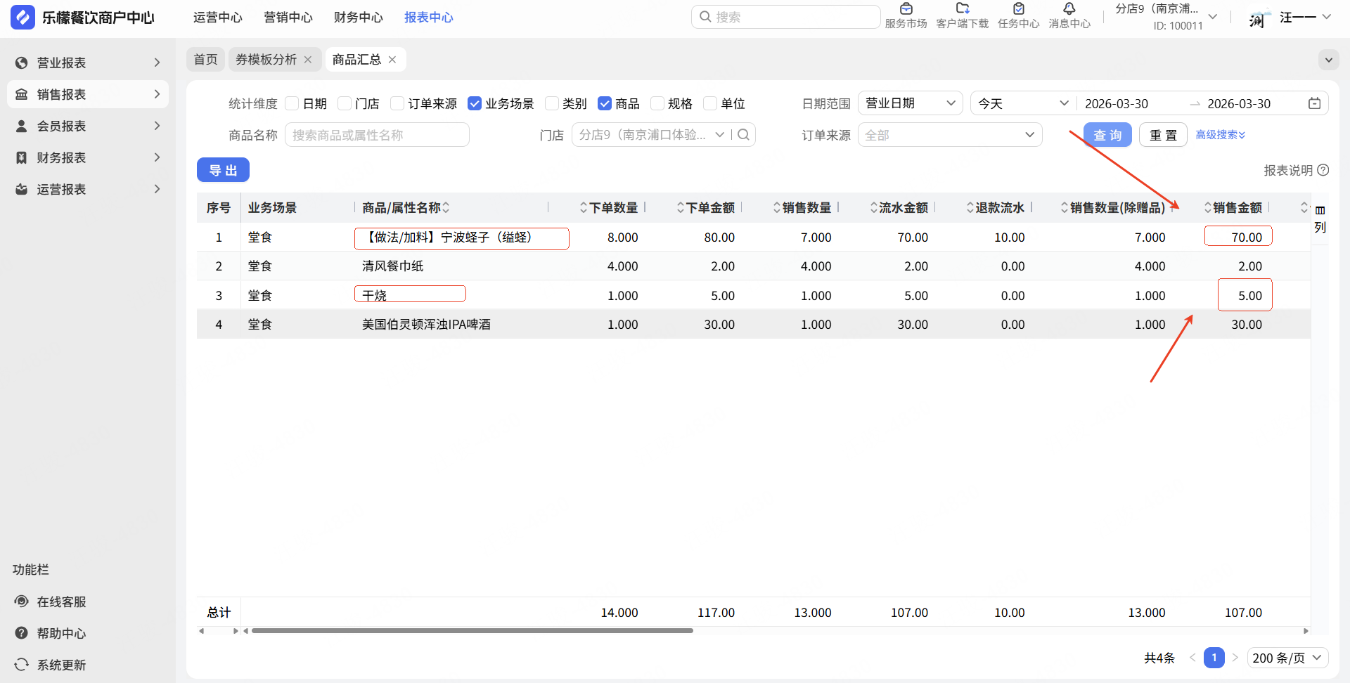 报表显示:蛏子:7*10=70元,干烧:5元