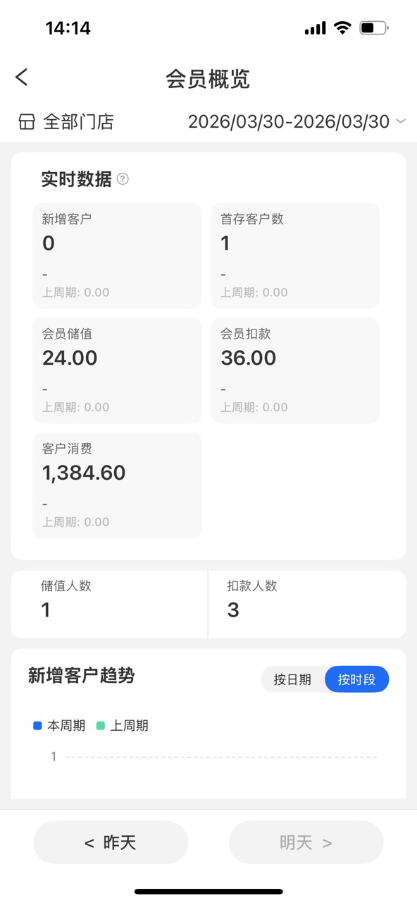 1.会员概览分为实时数据和客户消费数据,实时数据统计中增加储值人数和扣款人数统计,增加报表说明